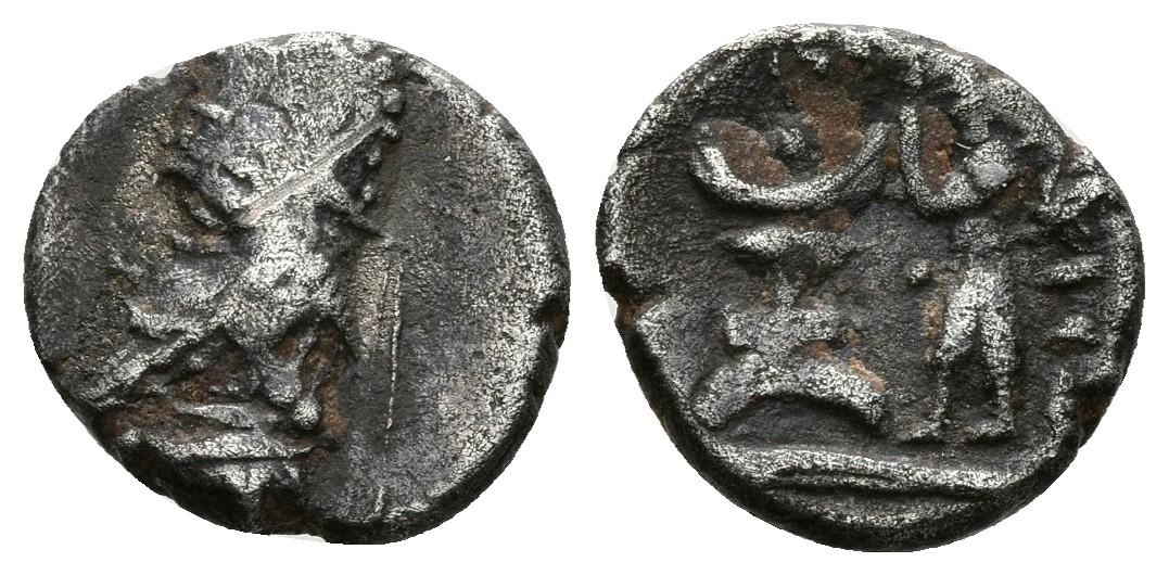 DARIOS (Darev) II. Obolo. Siglo I a.C. Reino Persis. A/ Busto a izquierda diademado con tiara de estilo parto rematada con creciente. R/ Rey en pie a izquierda sosteniendo cetro y sacrificando ante altar, alrededor inscripción parta. Alram 566. Ar. 0,71g. MBC.