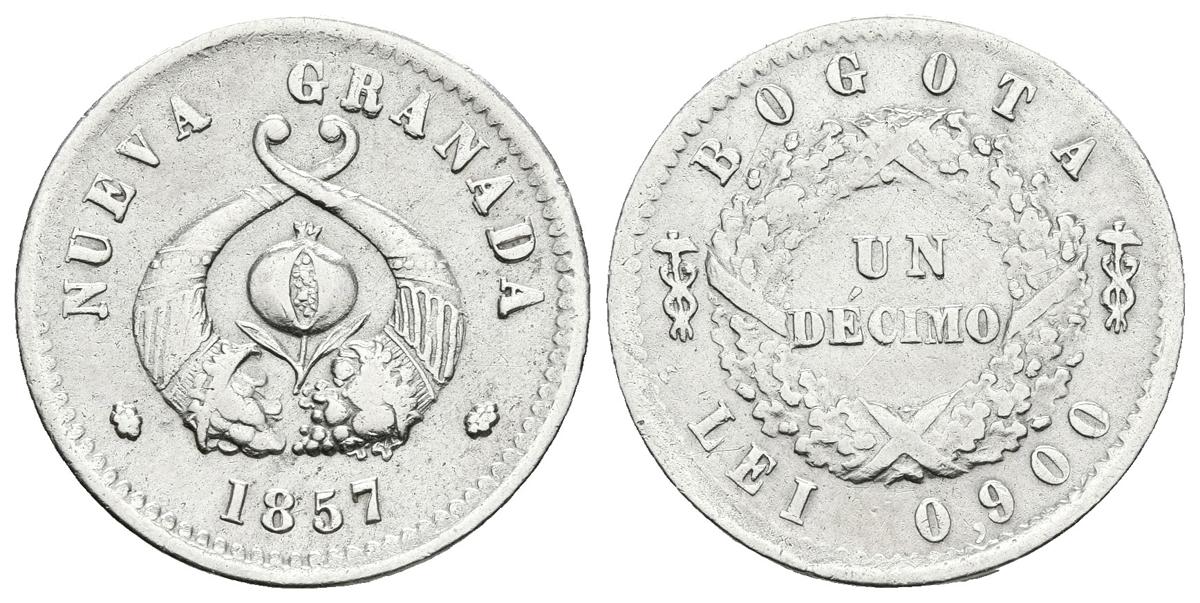 COLOMBIA, Nueva Granada. 1 Décimo. 1857. Bogotá. Km#115. Ar. 2,45g. MBC+. Escasa.