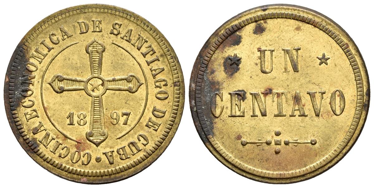 CUBA. Ficha 1 Centavo. 1897. Cocina económica de Santiago de Cuba. Latón. 3,94g. EBC.