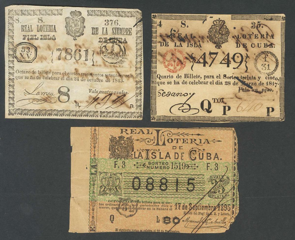 LOTERIA (ISLA DE CUBA). Lote compuesto por 3 Décimos de lotería pertenecientes a la Isla de cuba bajo el reinado de Fernando VII, Isabel II y Alfonso XIII, estos por valor de 1 Peso (1817), 4 Reales (1843) y 25 Centavos (1895). MBC+/MBC-. A EXAMINAR.