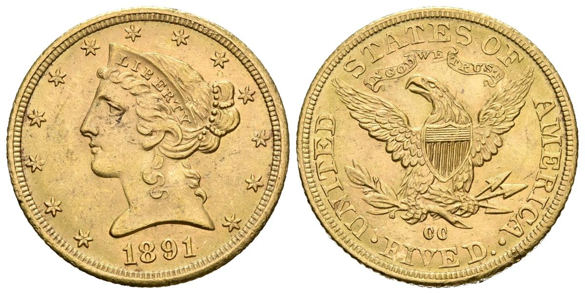 ESTADOS UNIDOS. 5 Dollars. 1891. Carson City CC. Km#101; Fr.146. Au. 8,36g. Brillo original. Leves marquitas. EBC+. Escasa.