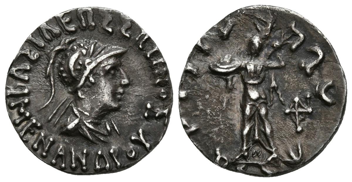BAKTRIA. Menander I Soter. Dracma. 155-130 a.C. Indo-Grecia. A/ Busto drapeado con coraza y casco con penacho a derecha, alrededor leyenda griega. R/ Athena Alkidemos avanzando a izquierda portando escudo decorado con aegis y lanzando rayo, a su derecha monograma y alrededor leyenda Karosthi. Bopearachchi Serie 16C; HGC 12, 193. Ar. 2,42g. EBC-.