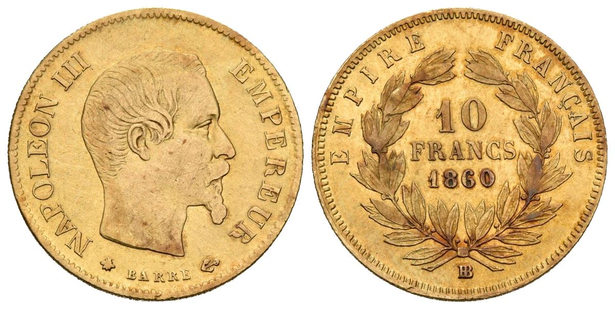 FRANCIA. Napoleón III. 10 Francs. 1860. Strasbourg BB. Fr. 577; Km#784.4. Au. 3,20g. MBC-.