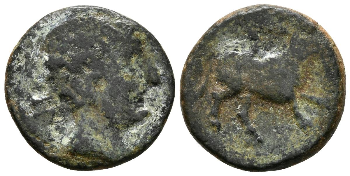 ABARILDUR. Semis. 120-20 a.C. Zona de Cataluña. A/ Cabeza masculina a derecha, detrás BoN. R/ Toro a derecha, encima ABaRILDuR. FAB-1. Ae. 3,85g. MBC-. Rara.