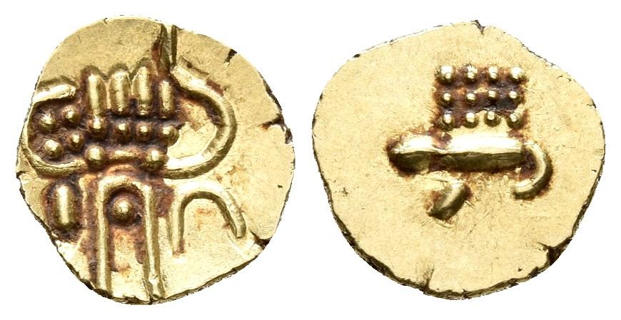 INDIA HOLANDESA. Fanam. (1675-1724). Cochín. A/ Figura estilizada de la deidad Kali. R / J horizontal con cuatro líneas de puntos. Cf. Friedberg 1504; Km#23; Fr-1400. Au. 0,40g. EBC.