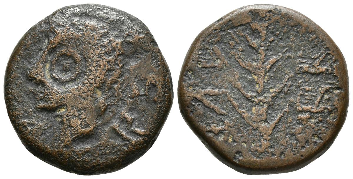 ARSA. As. 50 a.C. Zalamea de la Serena (Badajoz). A/ Cabeza masculina a izquierda, alrededor ARSA. R/ Espiga a izquierda, alrededor leyenda libio fenicia. FAB-131; ACIP. 910. Ae. 9,76g. BC+. Muy rara.
