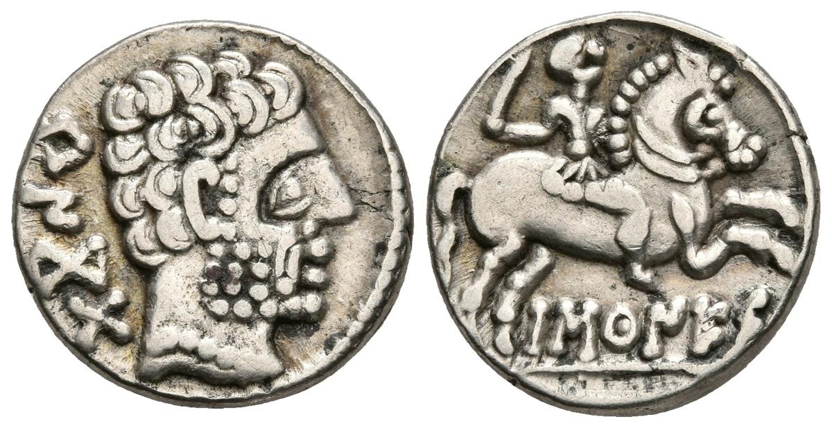 BASCUNES. Denario. 120-80 a.C. Pamplona. A/ Cabeza con barba a derecha, detrás leyenda ibérica BeNCoDa. R/ Jinete con espada a derecha, debajo BaSCuNES. FAB-215. Ar. 3,89g. MBC+.