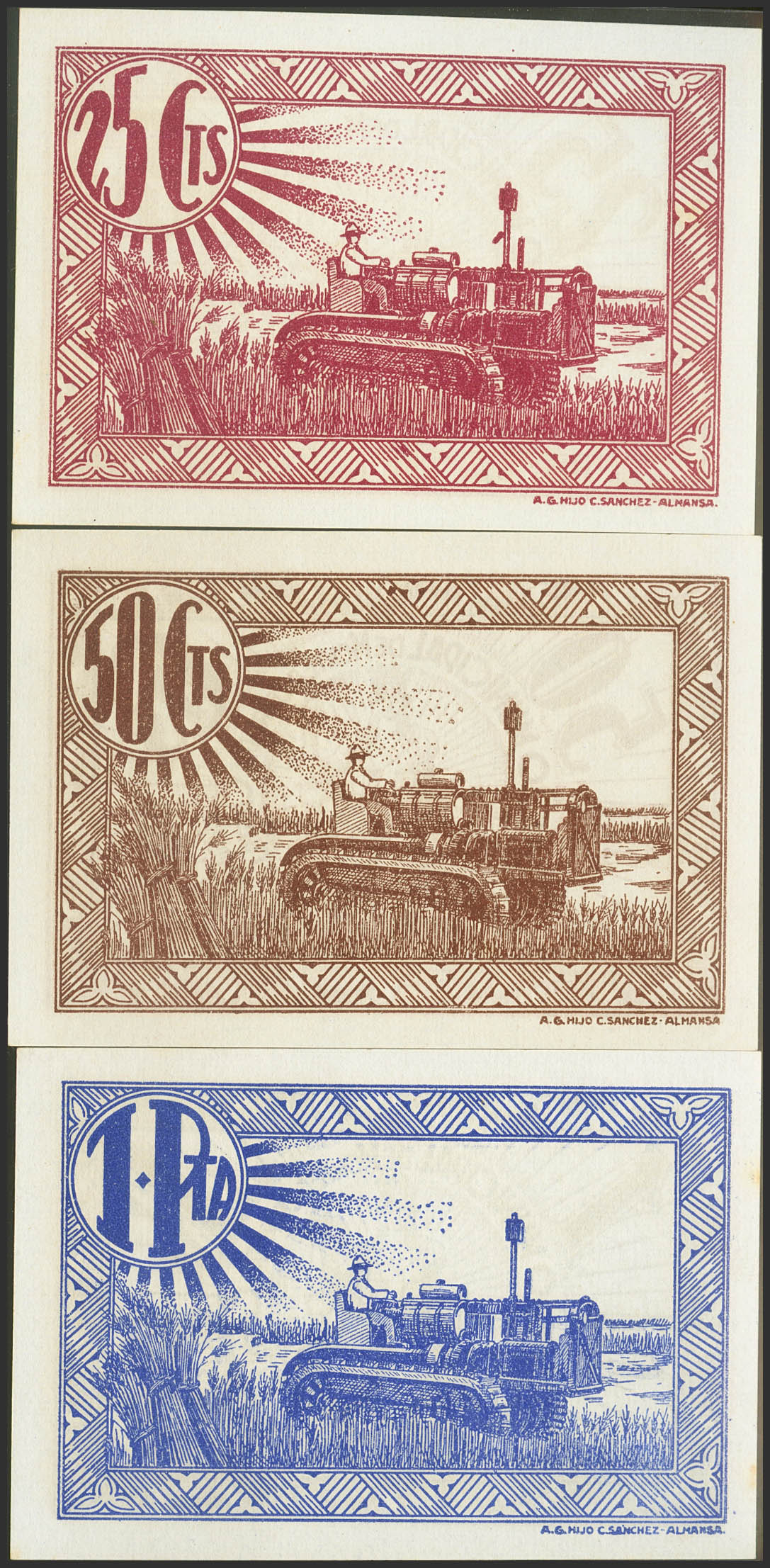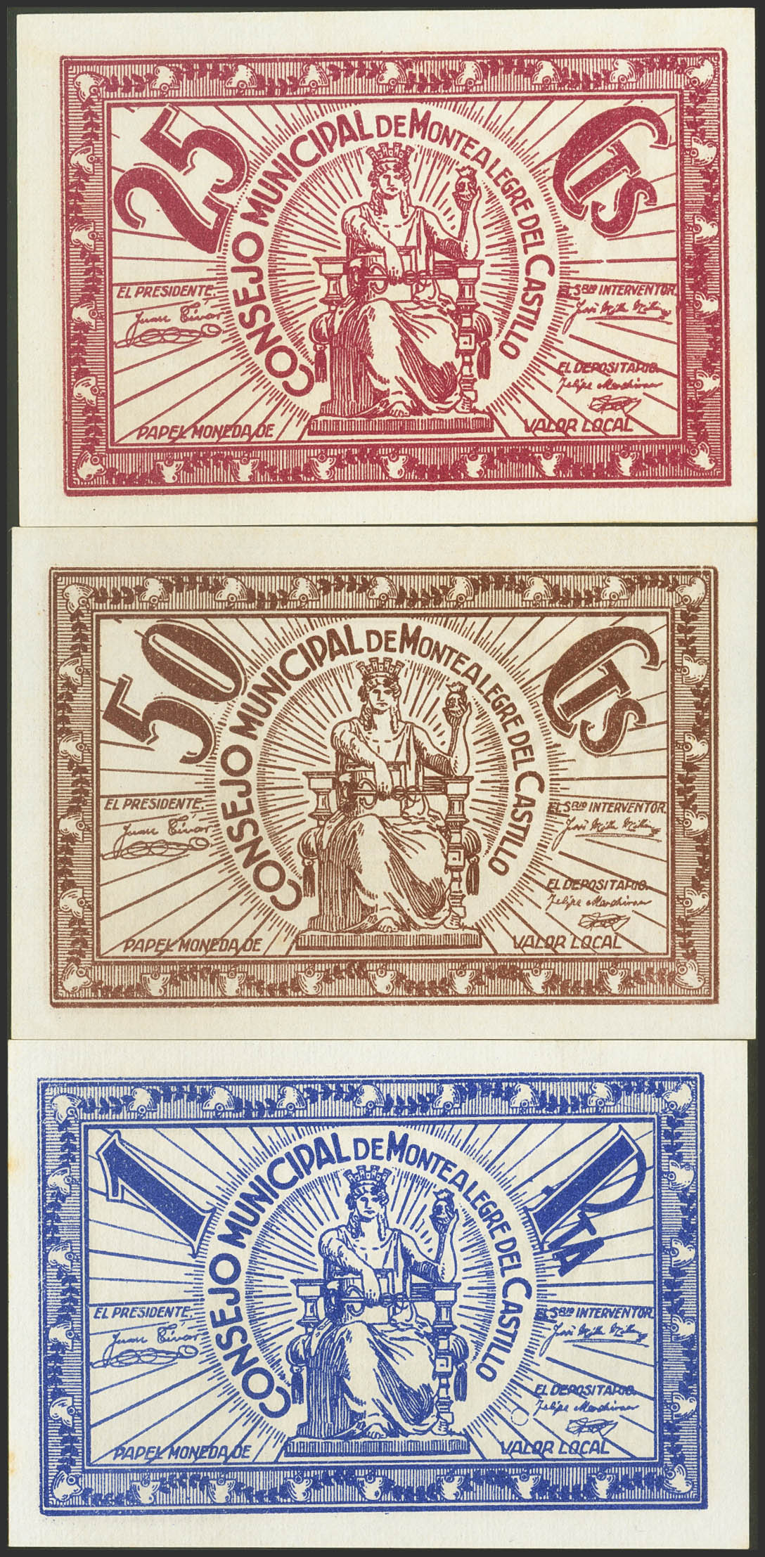 MONTEALEGRE DEL CASTILLO (ALBACETE). 25 Cents, 50 Cents and 1 Peseta. (1937ca). (González: 3639/41). Unusual complete series in this quality. Uncirculated/Uncirculated-.