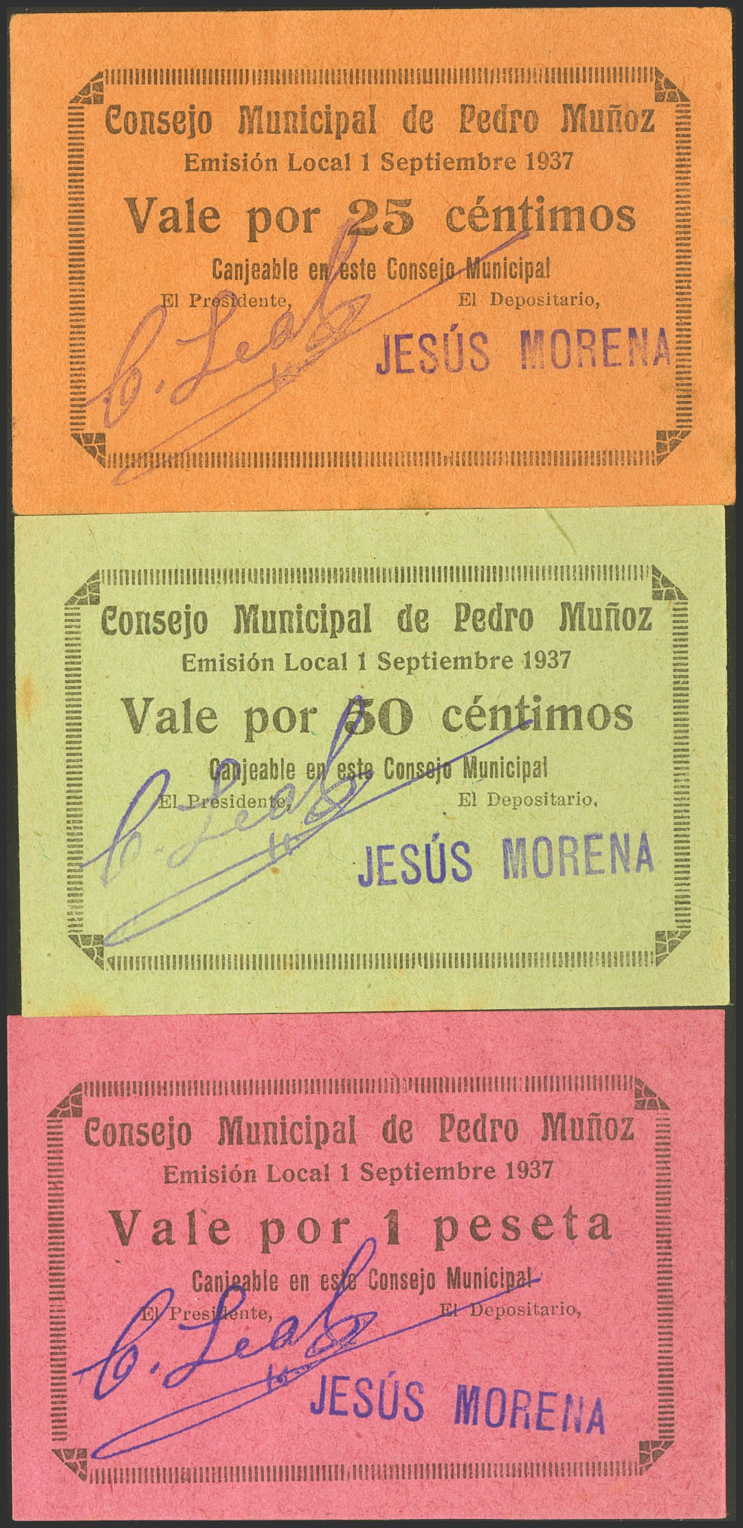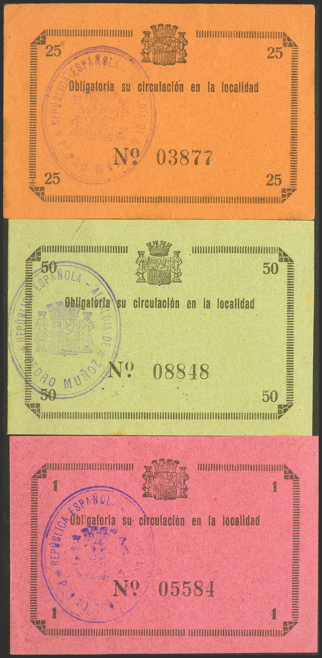 English PEDRO MUÑOZ (CIUDAD REAL). 25 Cents, 50 cents and 1 Peseta. September 1, 1937. (González: 4099/01). Rare complete series, especially in this quality. Extremely Fine/Good Extremely Fine++.