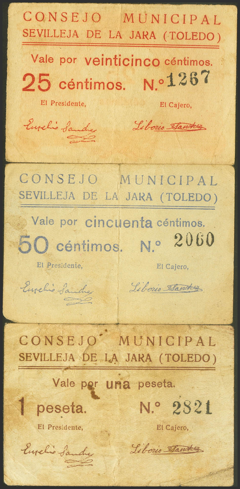 English SEVILLEJA DE LA JARA (TOLEDO). 25 Cents, 50 Cents and 1 peseta. (1937ca). (González: 4849, 4850, 4851). Extraordinarily rare. Very Fine.