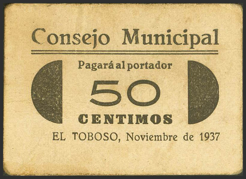 TOBOSO (TOLEDO). 50 Céntimos. Noviembre 1937. (González: 5023). Muy raro. EBC-.