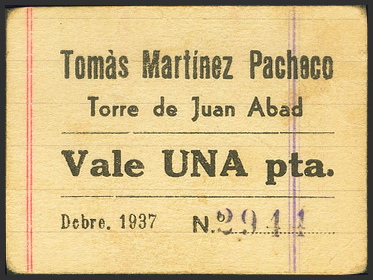 JUAN ABAD TOWER (CITY REAL). 1 Peseta. December 1937. (González: 5060). Very rare. Good Very Fine.