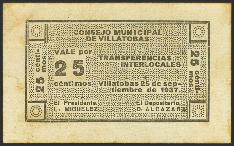 English VILLATOBAS (TOLEDO). 25 Cents. September 25, 1937. (González: 5749). Queer. Good Very Fine.