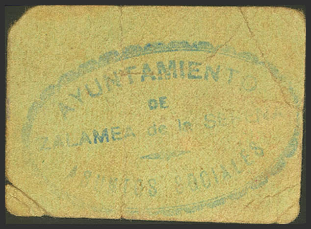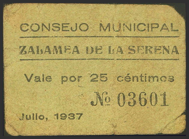 ZALAMEA DE LA SERENA (BADAJOZ). 25 Céntimos. Julio de 1937. (González: 5845). Raro, para hacernos idea de la rareza de este billete en el catálogo González no esta fotografiado. BC.