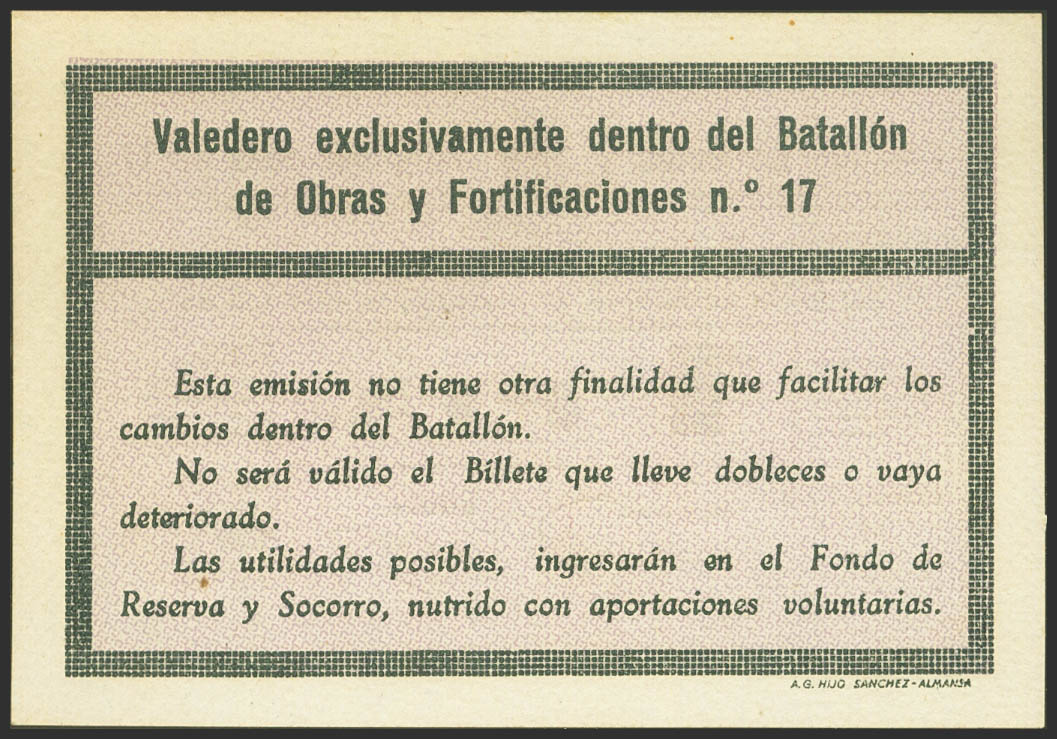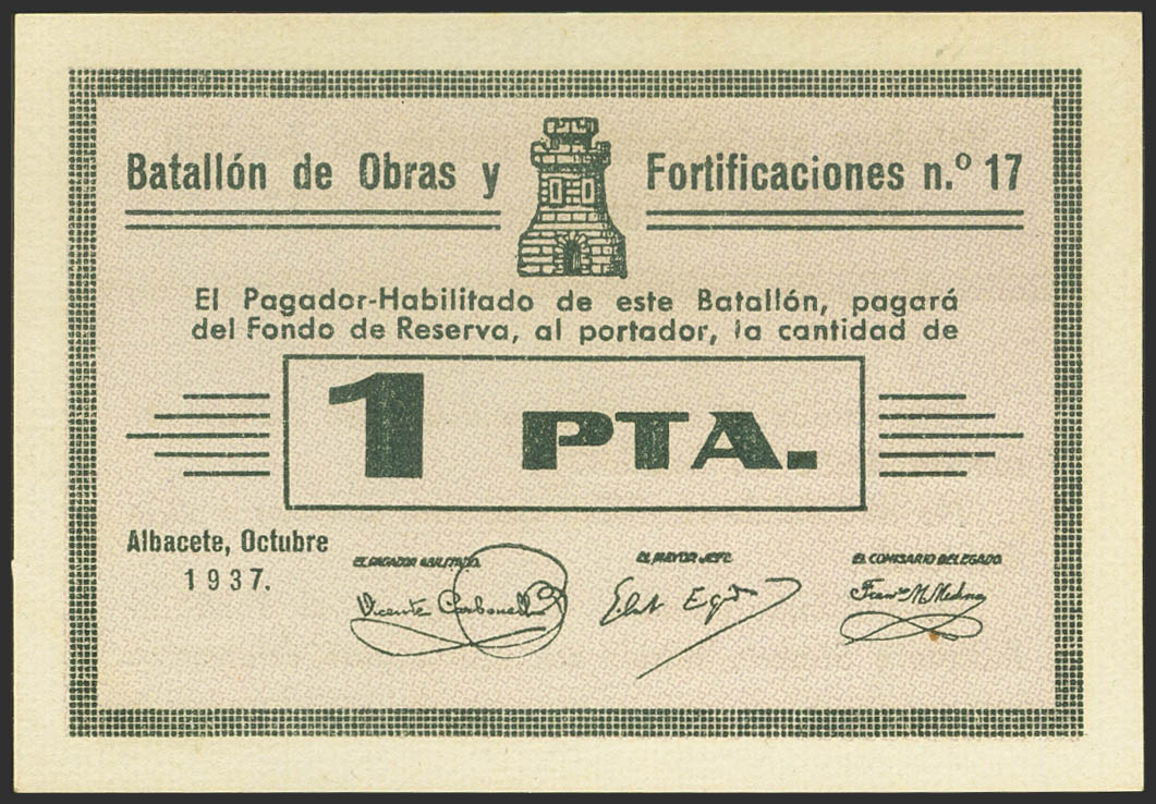 ALBACETE. 1 Peseta. Octubre de 1937. Batallón de Obras y Fortificaciones. (González: 5892). SC-.