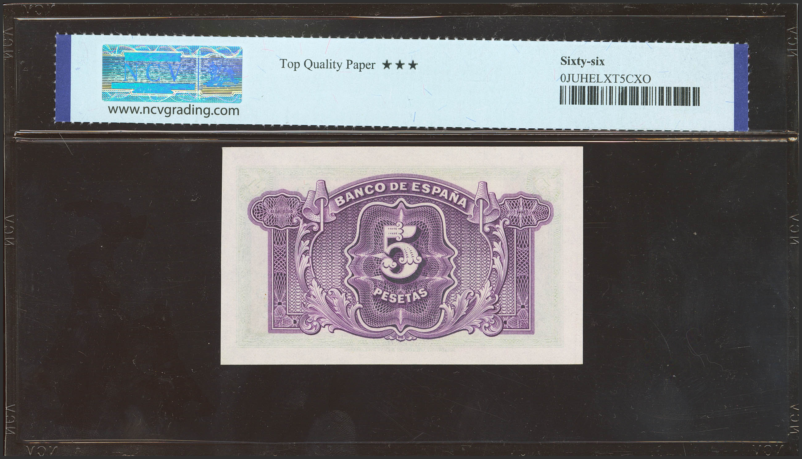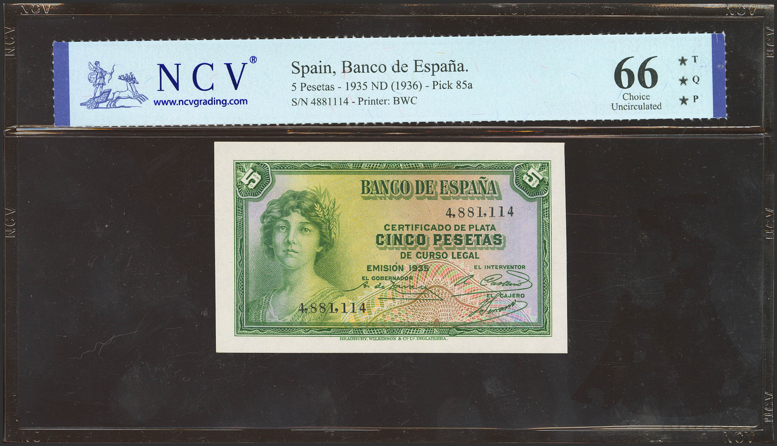5 Pesetas. 1935. Silver Certificate. No serie. (Edifil 2023: 363, Pick: 85a). Unusual in this exceptional quality, original sizing. Uncirculated. NCV66TQP package.