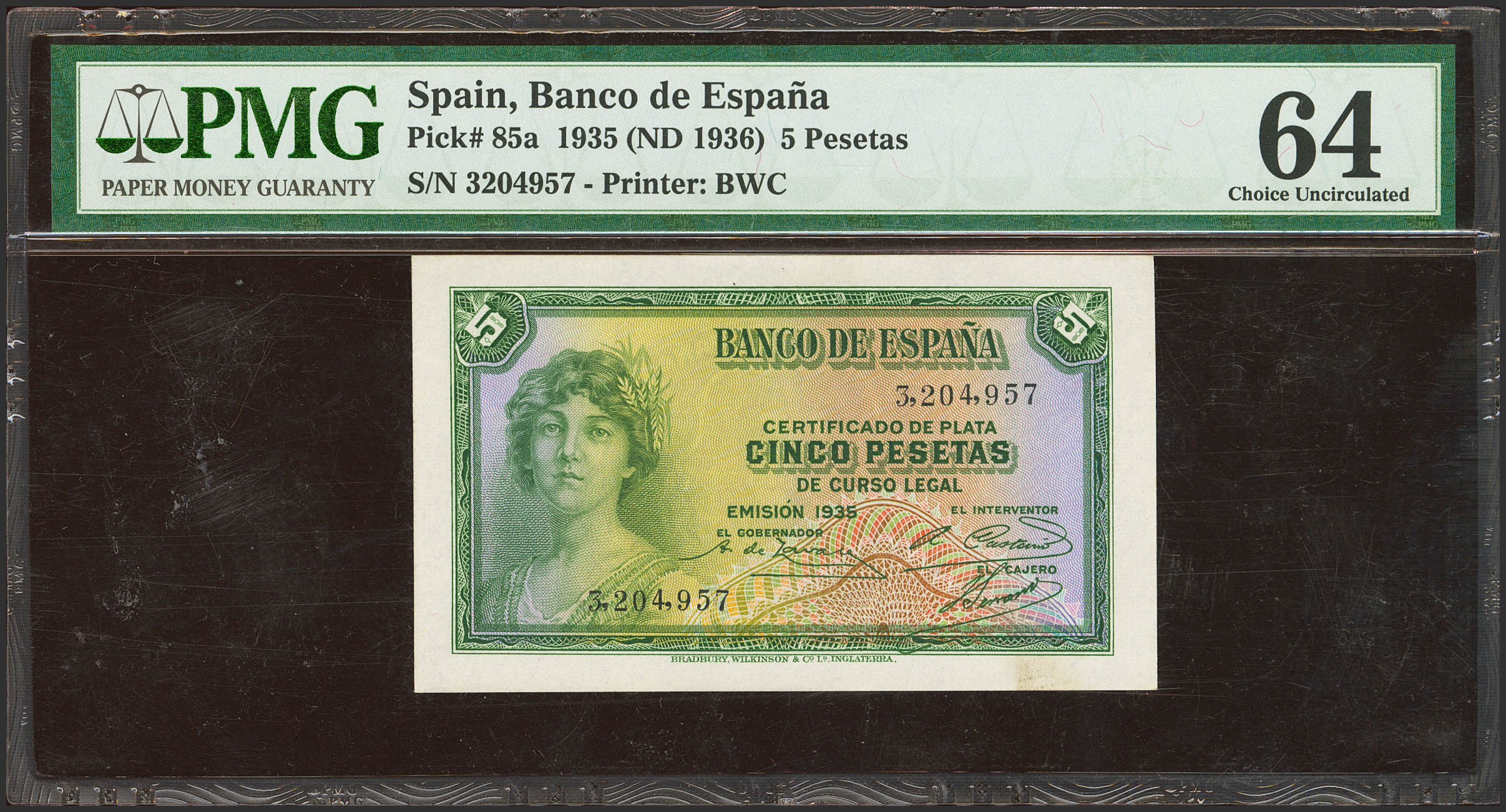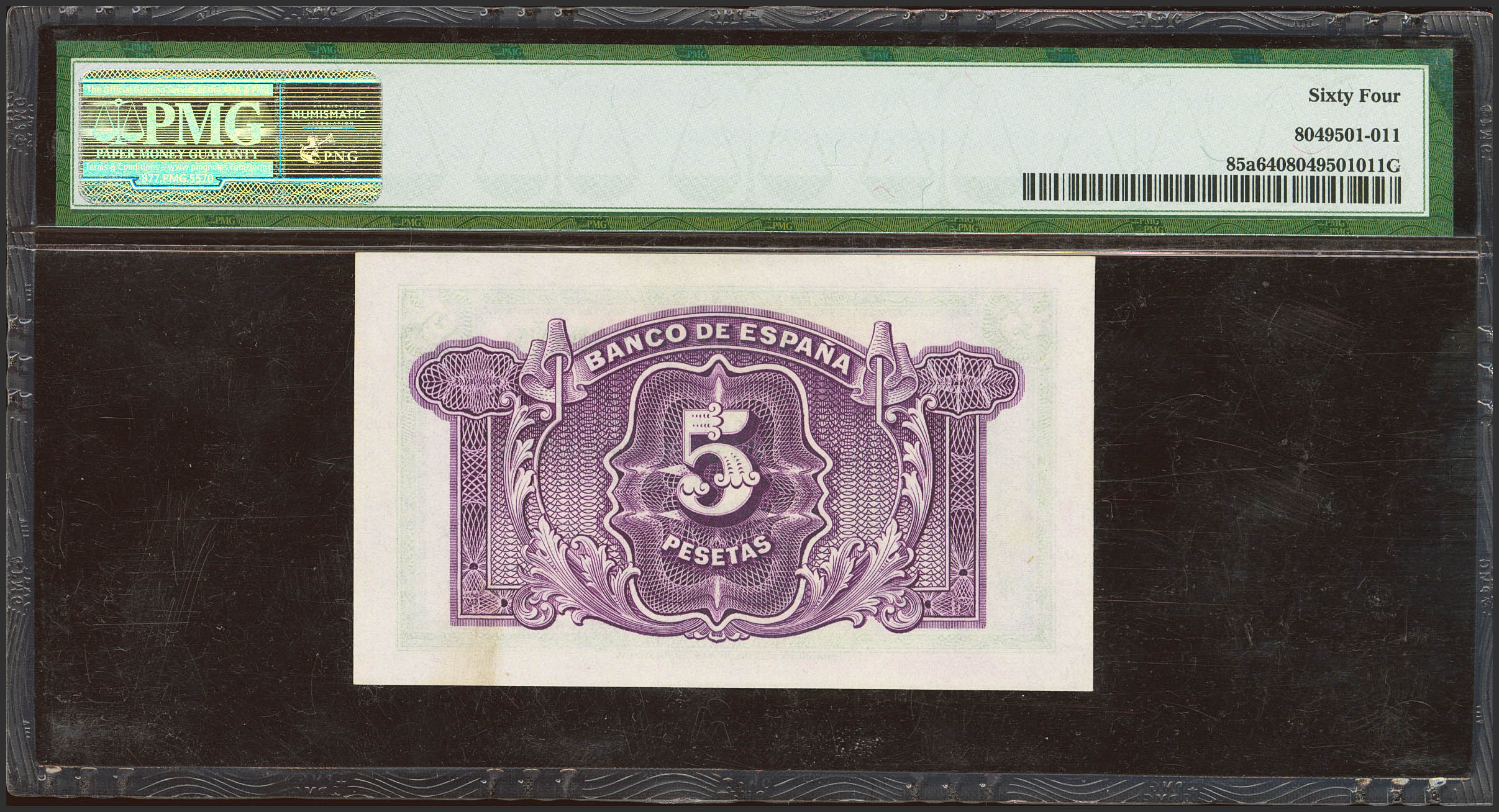 5 Pesetas. 1935. Silver Certificate. No serie. (Edifil 2023: 363, Pick: 85a). Uncirculated. PMG64 encapsulation.