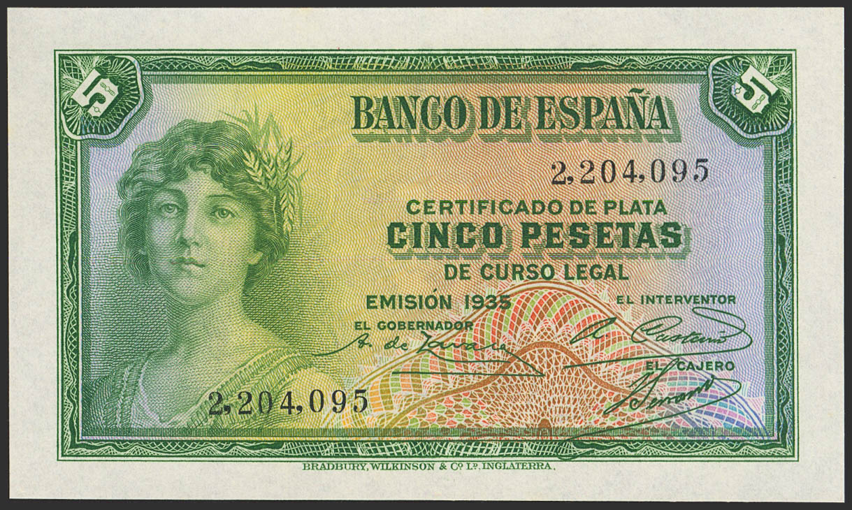 5 Pesetas. 1935. Silver Certificate. No serie. (Edifil 2023: 363). It retains all its original finish. Uncirculated.