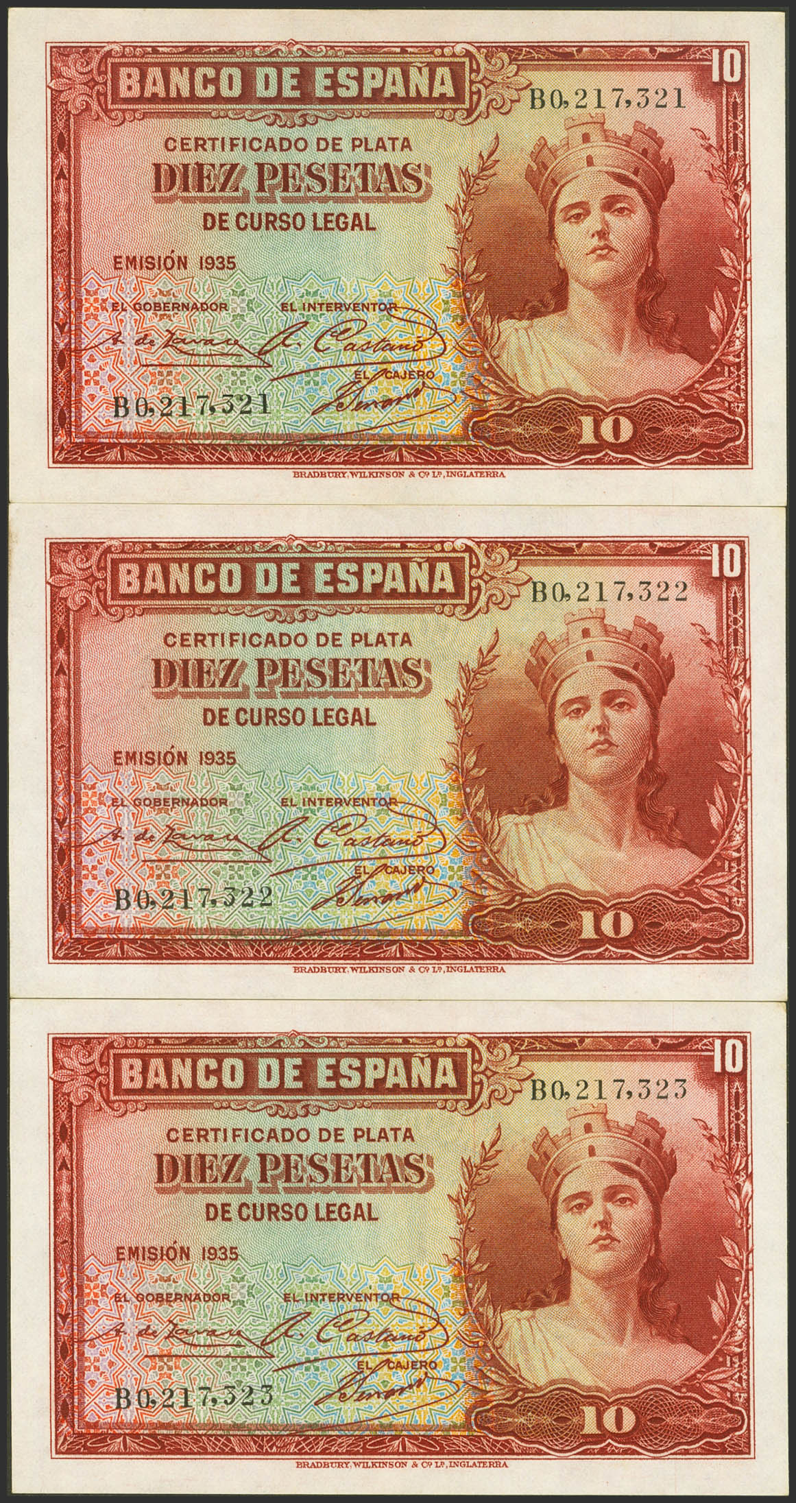10 Pesetas. 1935. Silver Certificate. Correlative trio. Series B. (Edifil 2023: 364a). It retains all its original finish. Uncirculated-.