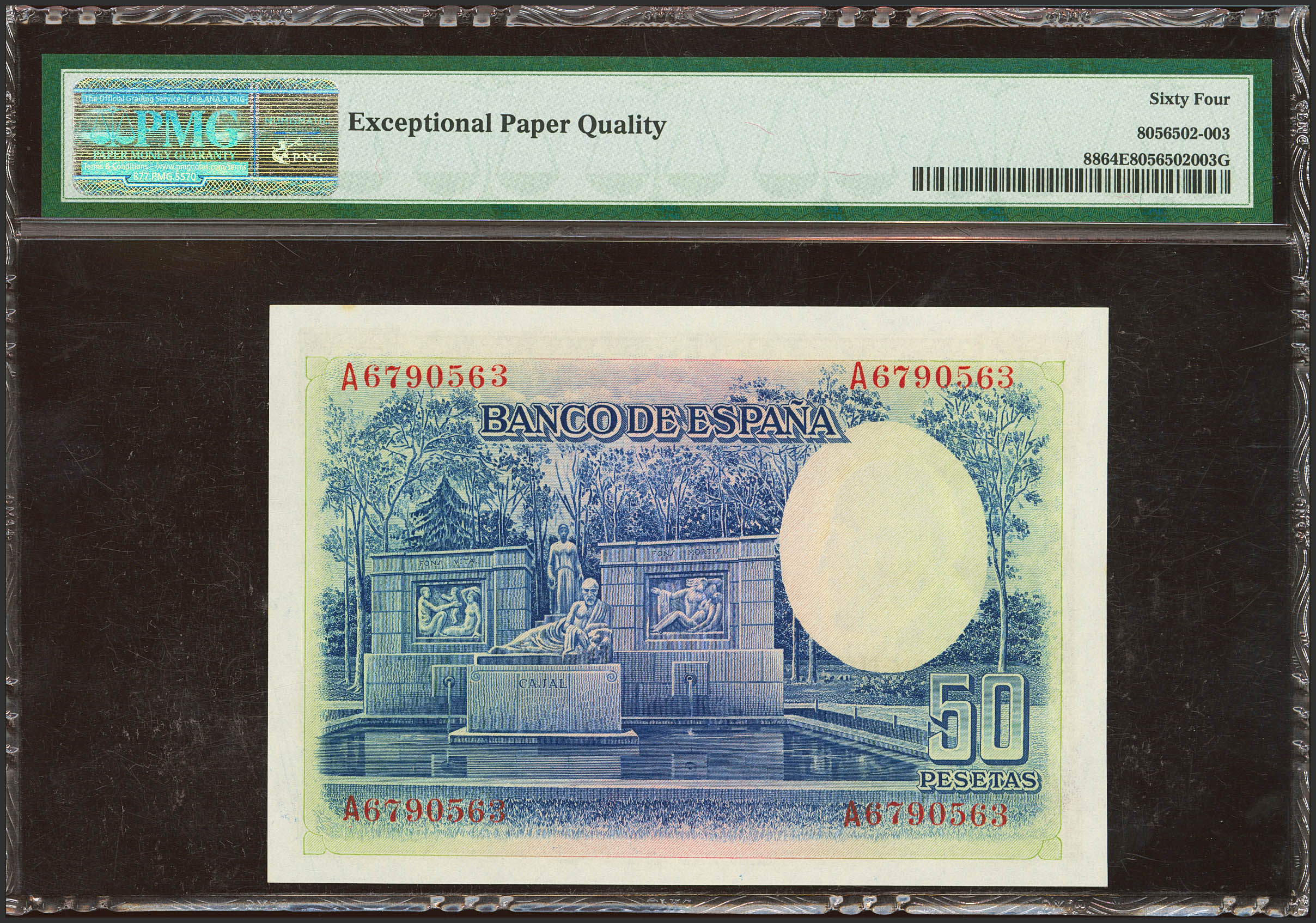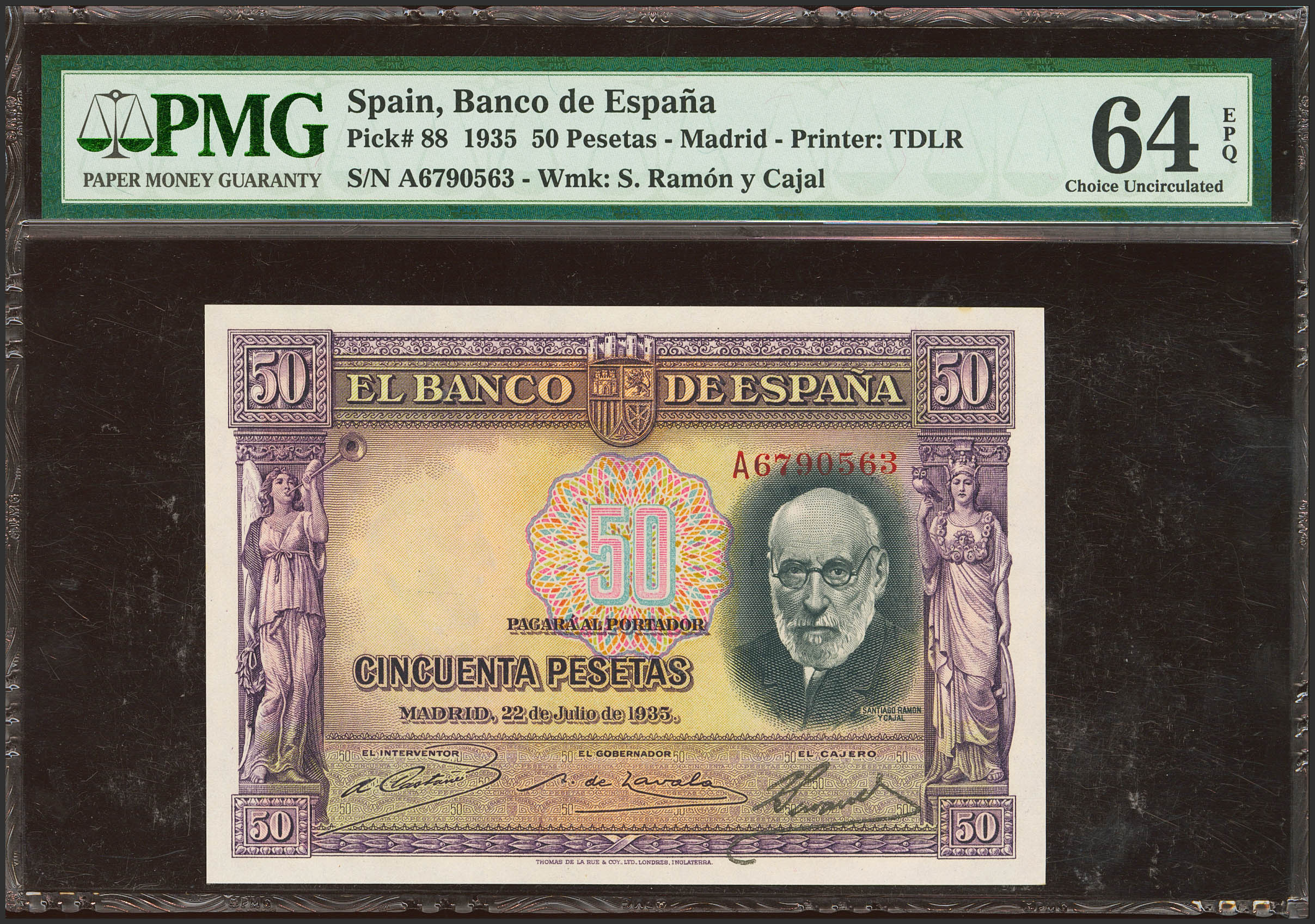 50 Pesetas. July 22, 1935. Series A. (Edifil 2023: 366a, Pick: 88b). Original sizing. Uncirculated. PMG64EPQ package.