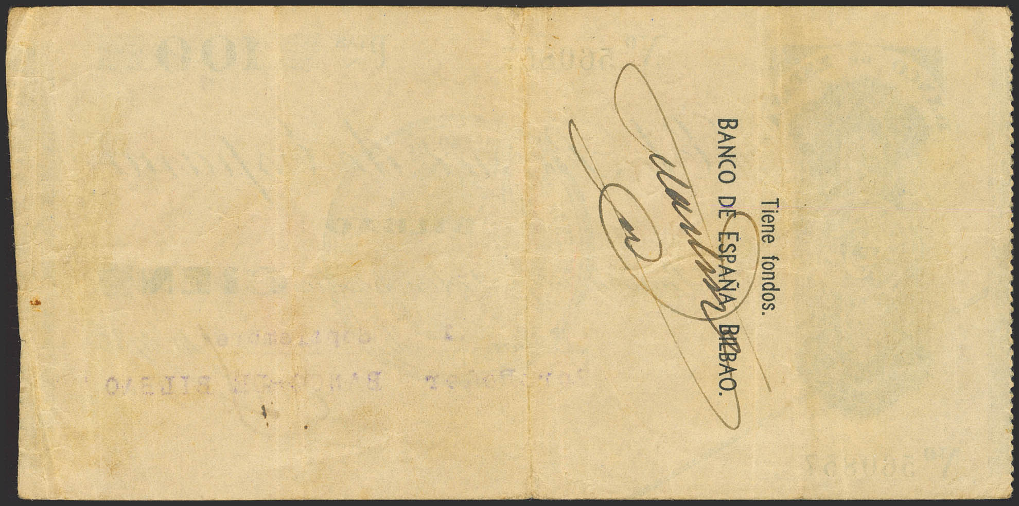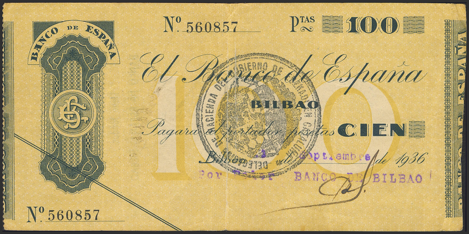 100 Pesetas. 1936. No series. Bilbao branch and pre-signature Banco de Bilbao and on the obverse stamp GOVERNMENT OF EUZKADI / EUZKADIKO JAURIARITZA / HACIENDA, in black, magnificent stamping. (Edifil 2023: 371f). Very rare. Very Fine.