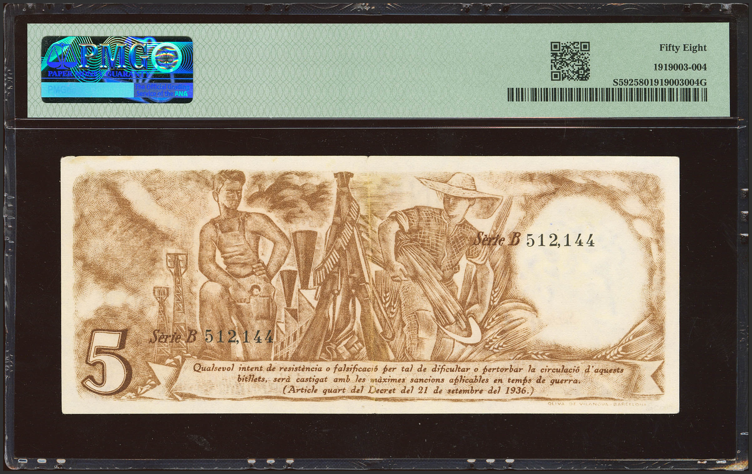5 Pesetas. September 25, 1936. Generalitat de Catalunya. Series B. (Edifil 2023: 373, Pick: 592). Rare in this quality. Good Extremely Fine+. Encapsulated PMG58 (to give us an idea of the rarity, as of March 1, 2024, this bill is the fifth best rated along with two other bills in PMG).