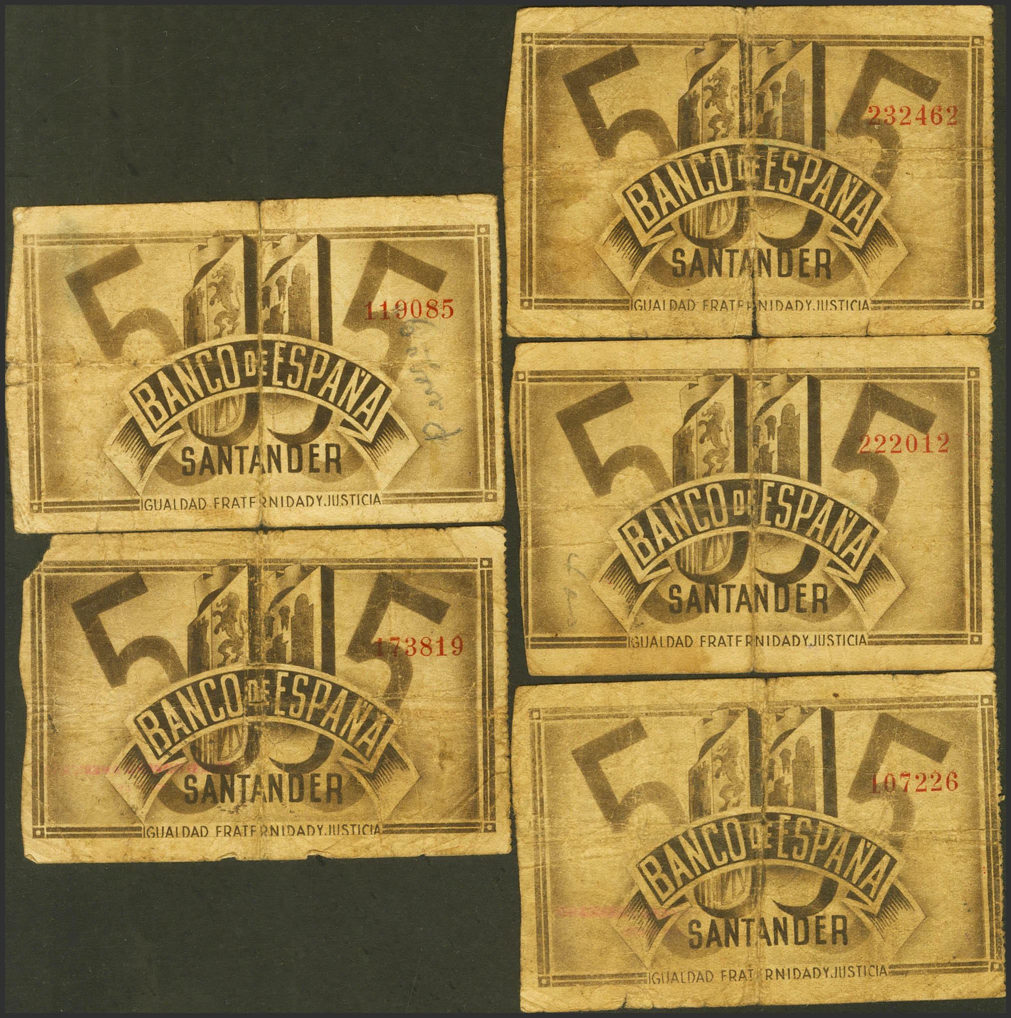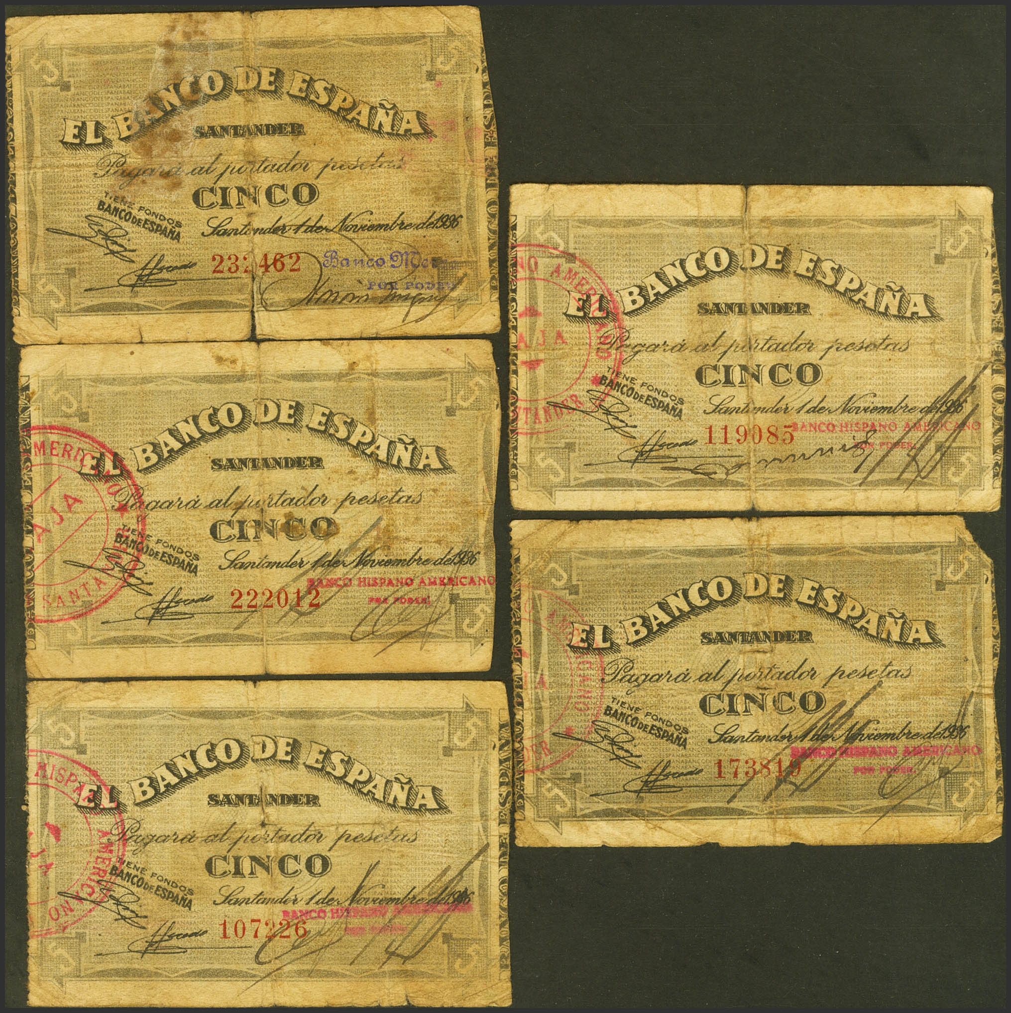 Set of 5 5 Pesetas banknotes from Banco de Santander, issued on November 1, 1936, all of them without series and with various antesignatures. (Edifil 2023: 375). Very Fine-/Good Fine.