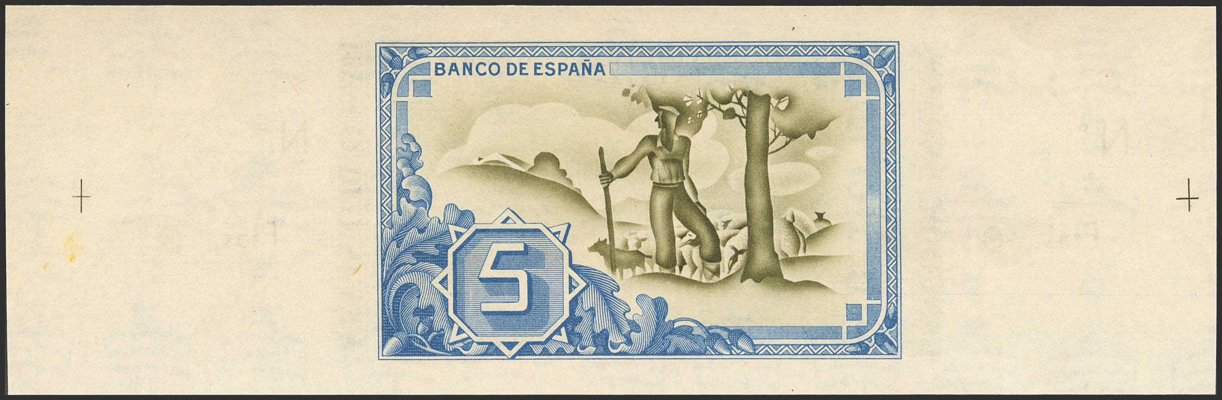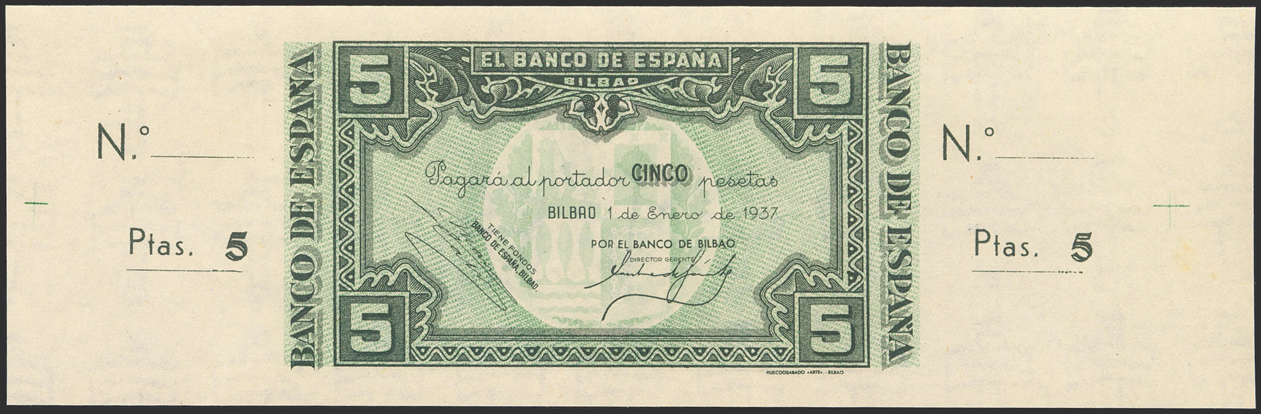 5 Pesetas. January 1, 1937. Bilbao Branch, presigned by Banco de Bilbao. Without series and without numbering, with both matrices. (Edifil 2023: 385c). Original sizing. Uncirculated.