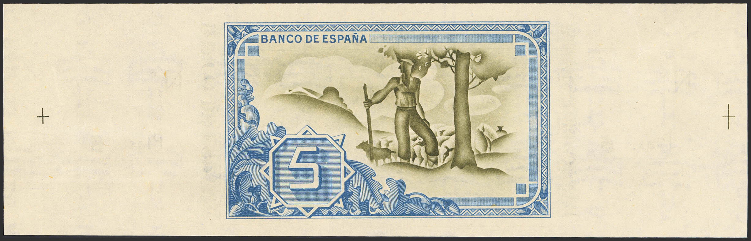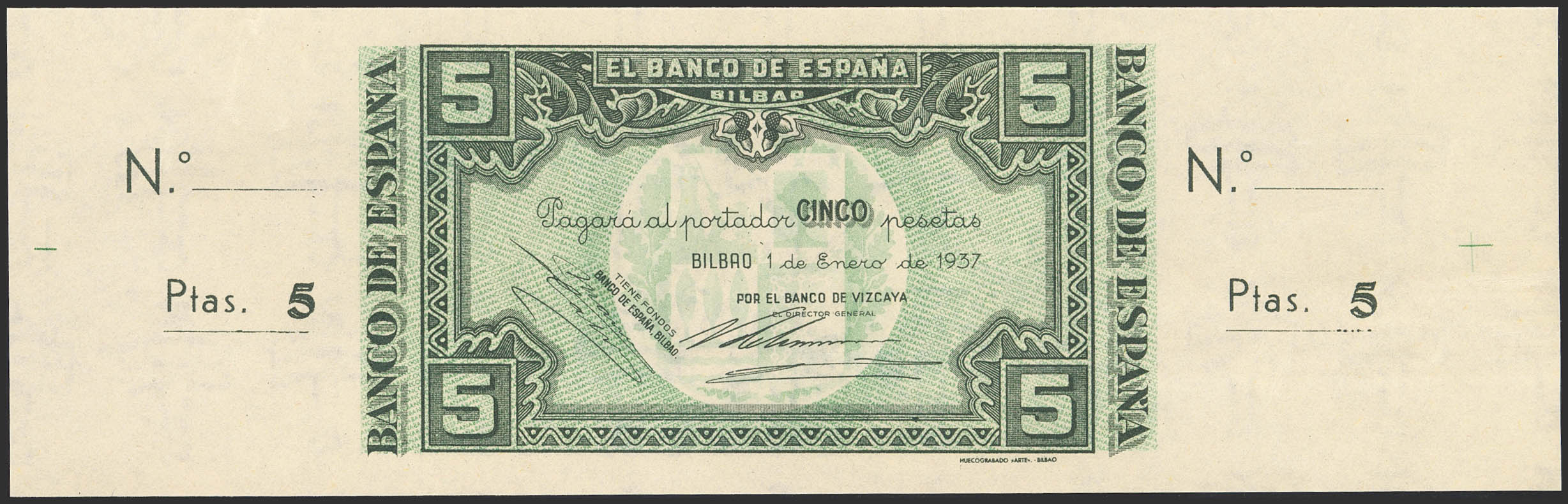 5 Pesetas. January 1, 1937. Bilbao Branch, presigned by Banco de Vizcaya. Without series and without numbering, with both matrices. (Edifil 2023: 385f). Original sizing. Uncirculated-.