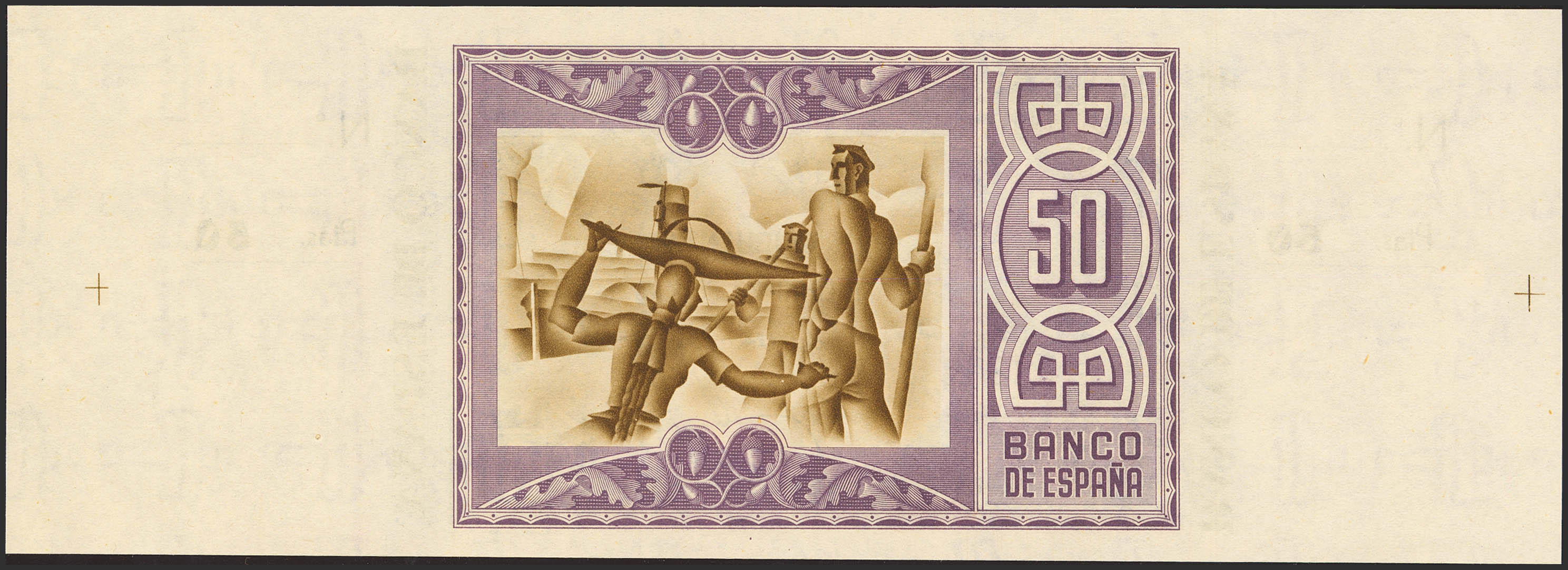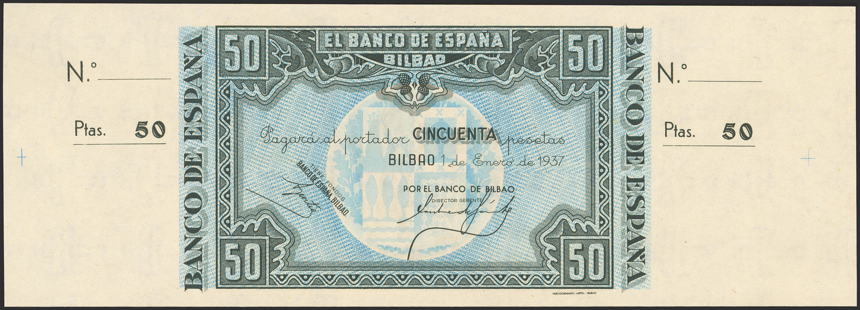 50 Pesetas. January 1, 1937. Bilbao Branch, presigned by Banco de Bilbao. Without series and without numbering, with both matrices. (Edifil 2023: 389a). Original sizing. Uncirculated.