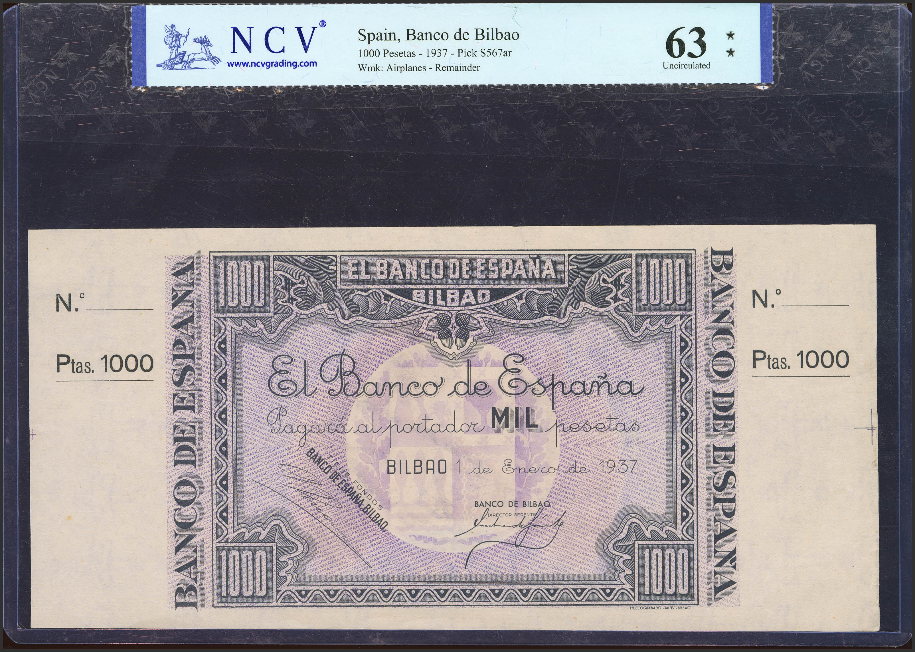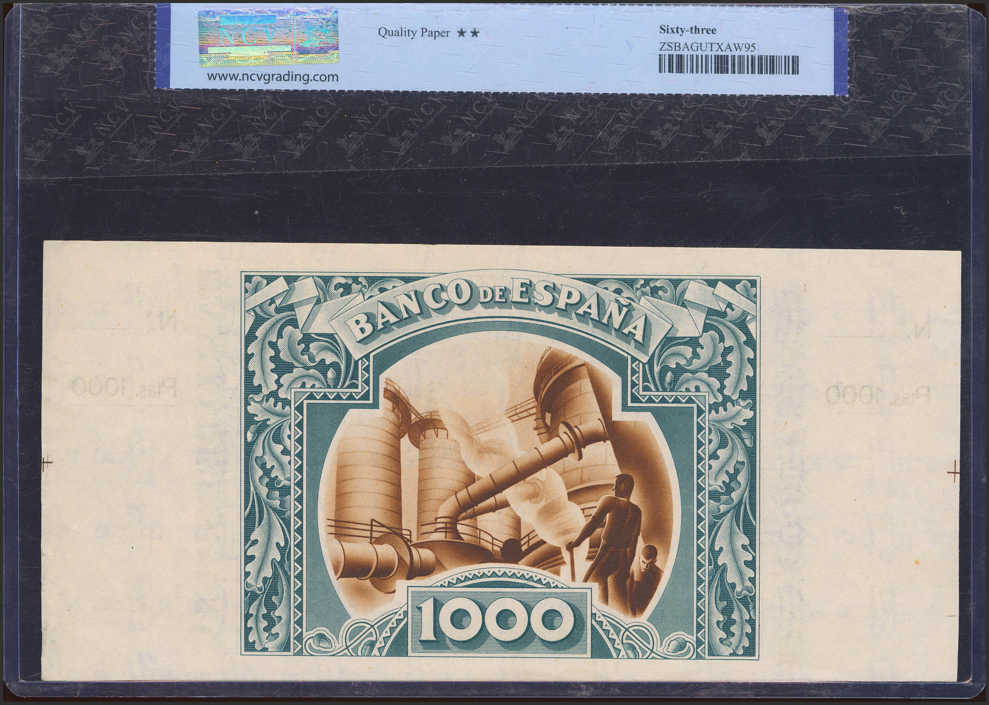 1000 Pesetas. January 1, 1937. Bilbao Branch, presigned by Banco de Bilbao. Not issued, without series and without numbering, with both matrices. (Edifil 2021: NE27a, Pick: S567ar). Uncirculated. NCV63 encapsulation.