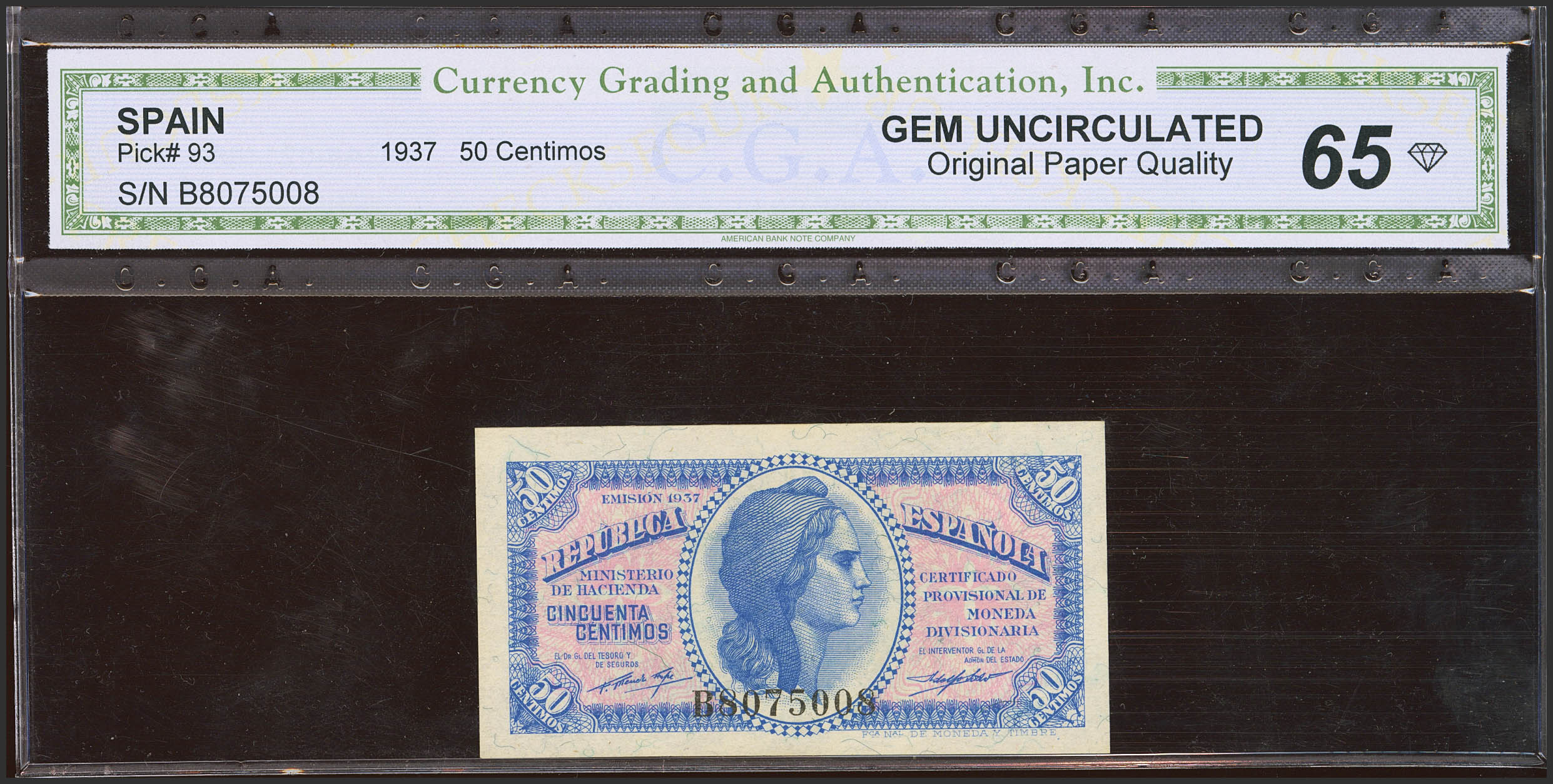 50 Cents. 1937. Ministry of Finance. Series B. (Edifil 2023: 391, Pick: 93). Uncirculated. CGA65 encapsulation.