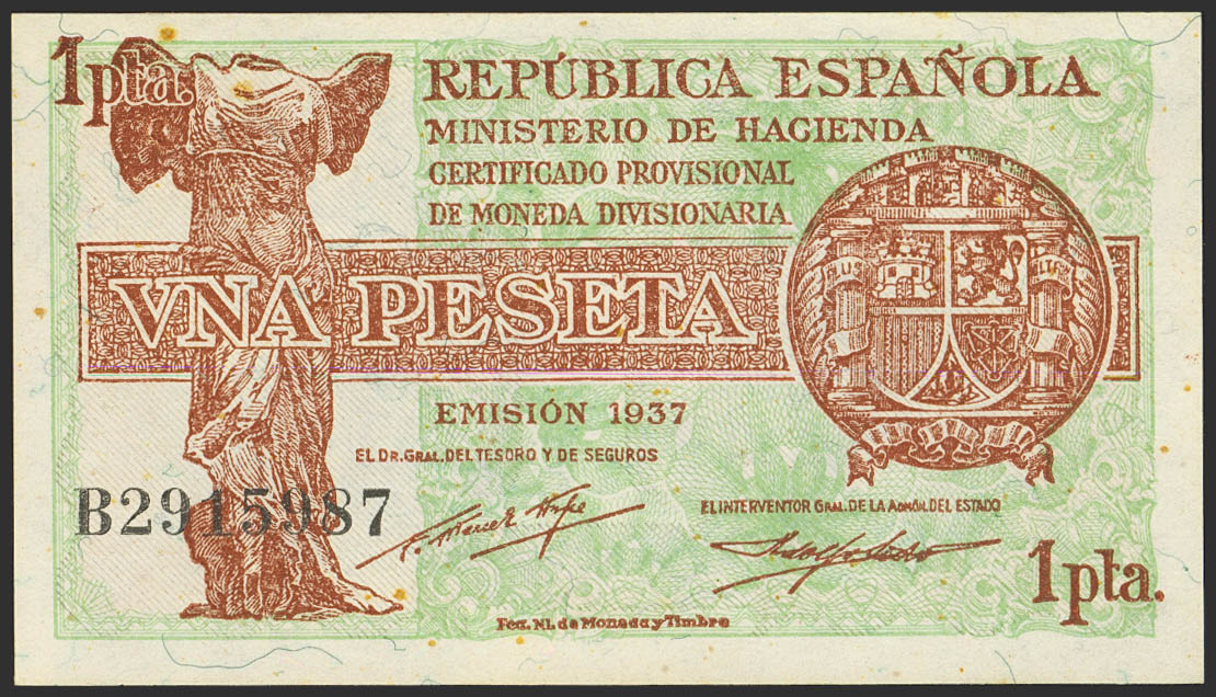 English 1 Peseta. 1937. Series B. (Edifil 2023: 392). Original sizing, typical points of time. Uncirculated-.
