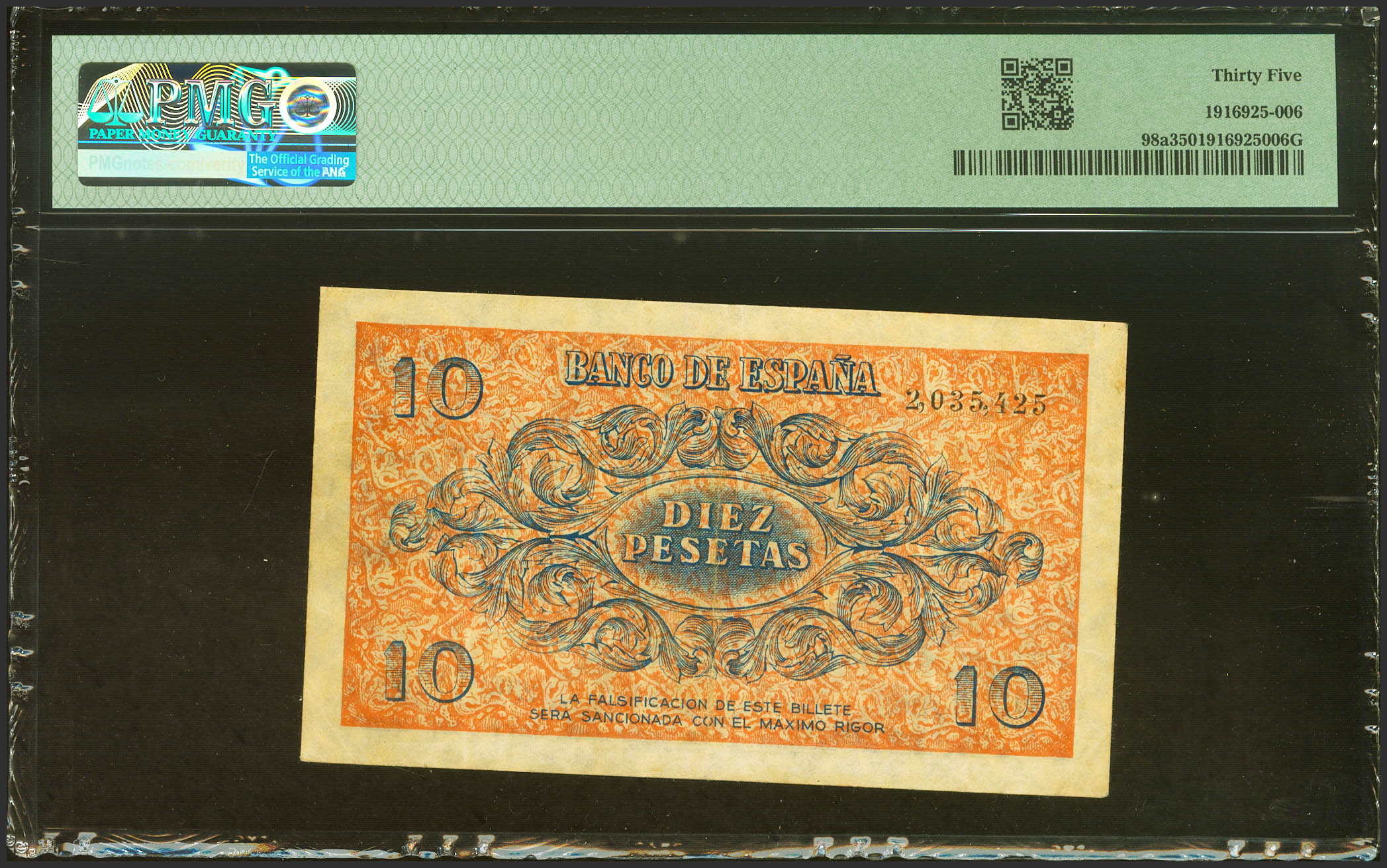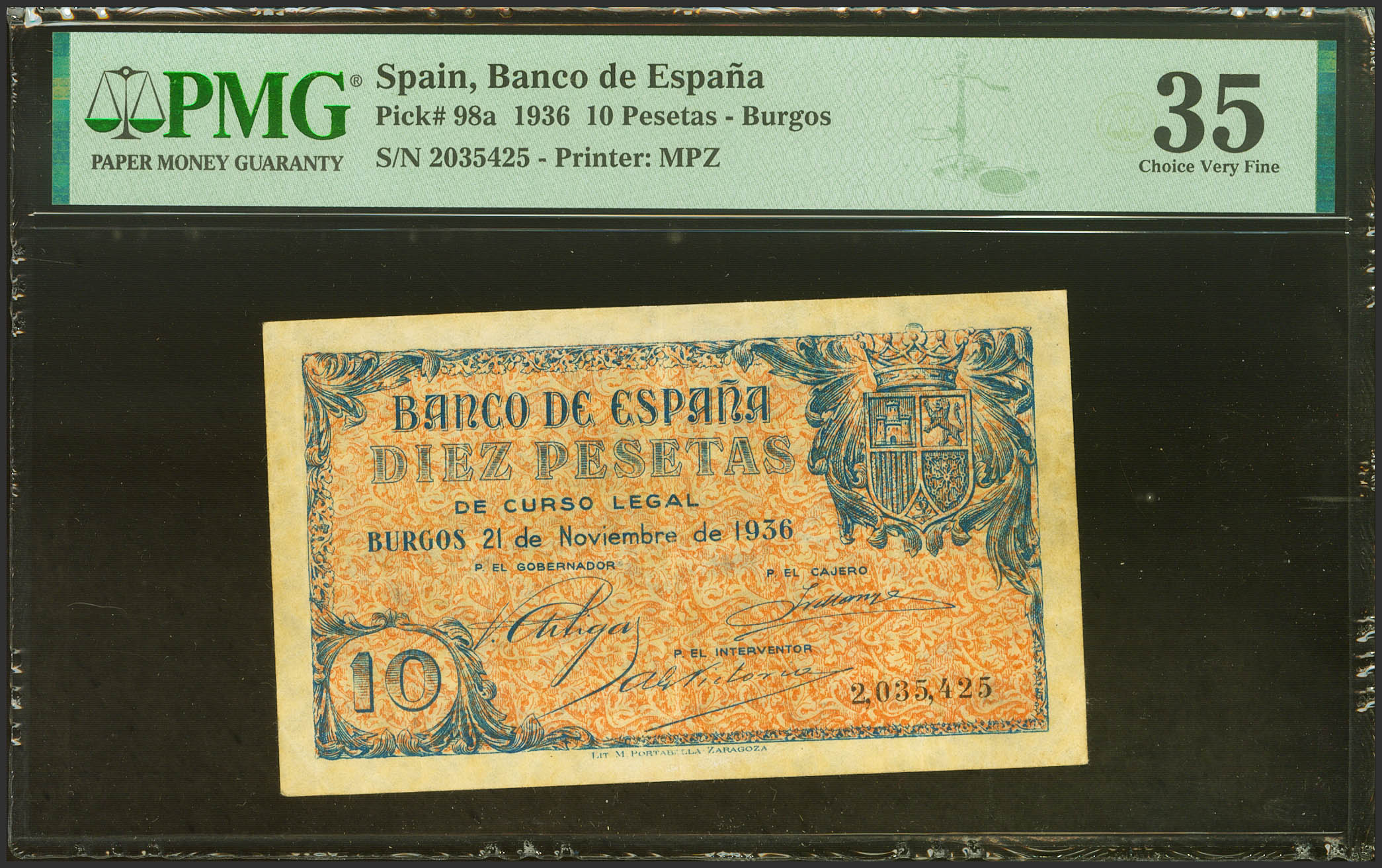 10 Pesetas. November 21, 1936. No series. (Edifil 2023: 418, Pick: 98a). Unusual in this quality. Good Very Fine. PMG35 package