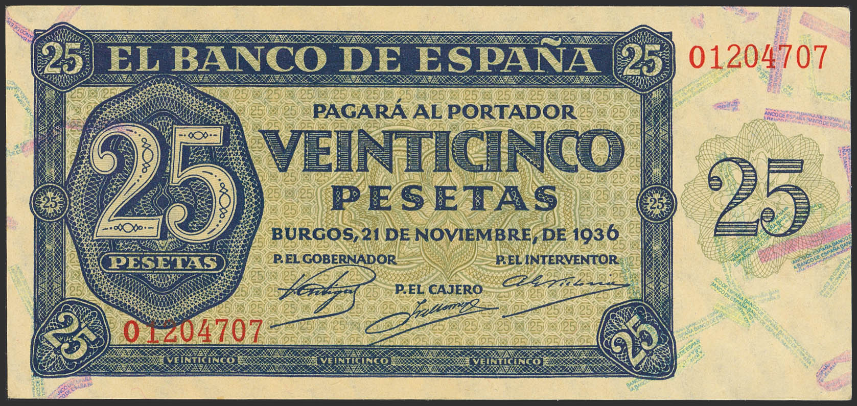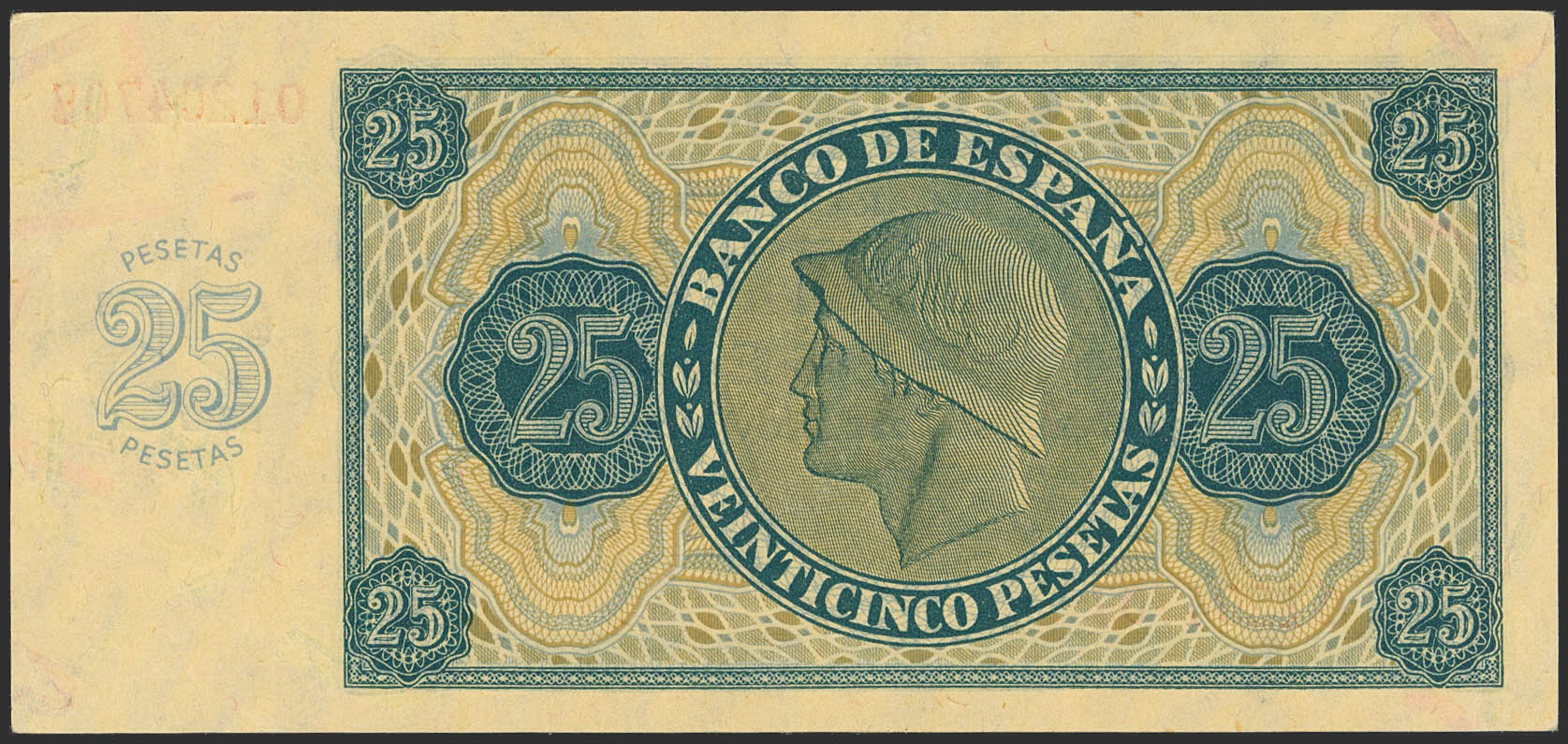 25 Pesetas. November 21, 1936. Series O. (Edifil 2023: 419a). It retains all its original finish. Uncirculated-.