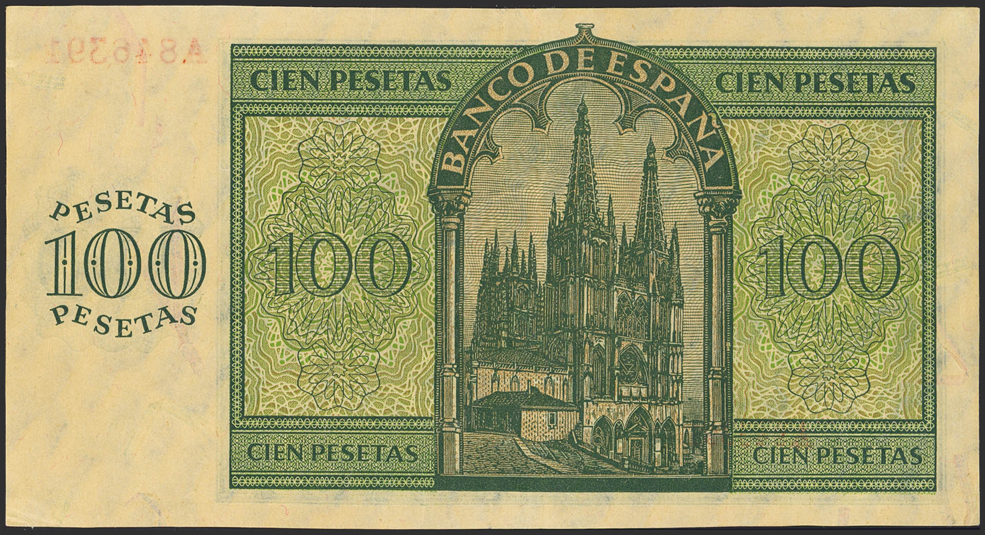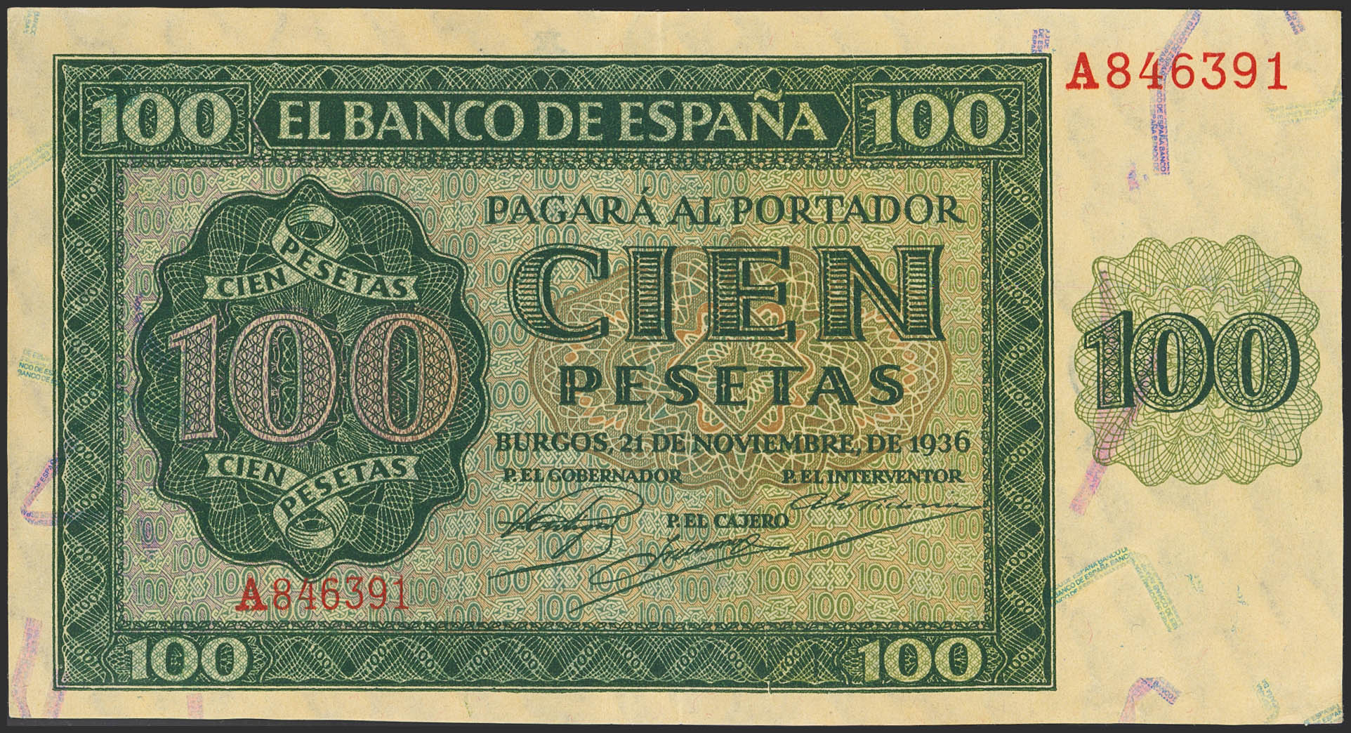100 Pesetas. November 21, 1936. Series A. (Edifil 2023: 421). It retains part of the original finish. Extremely Fine-.