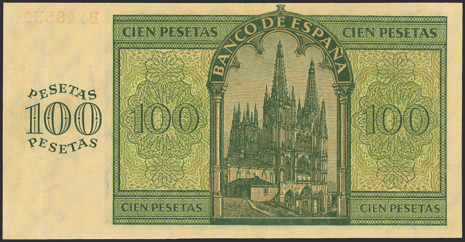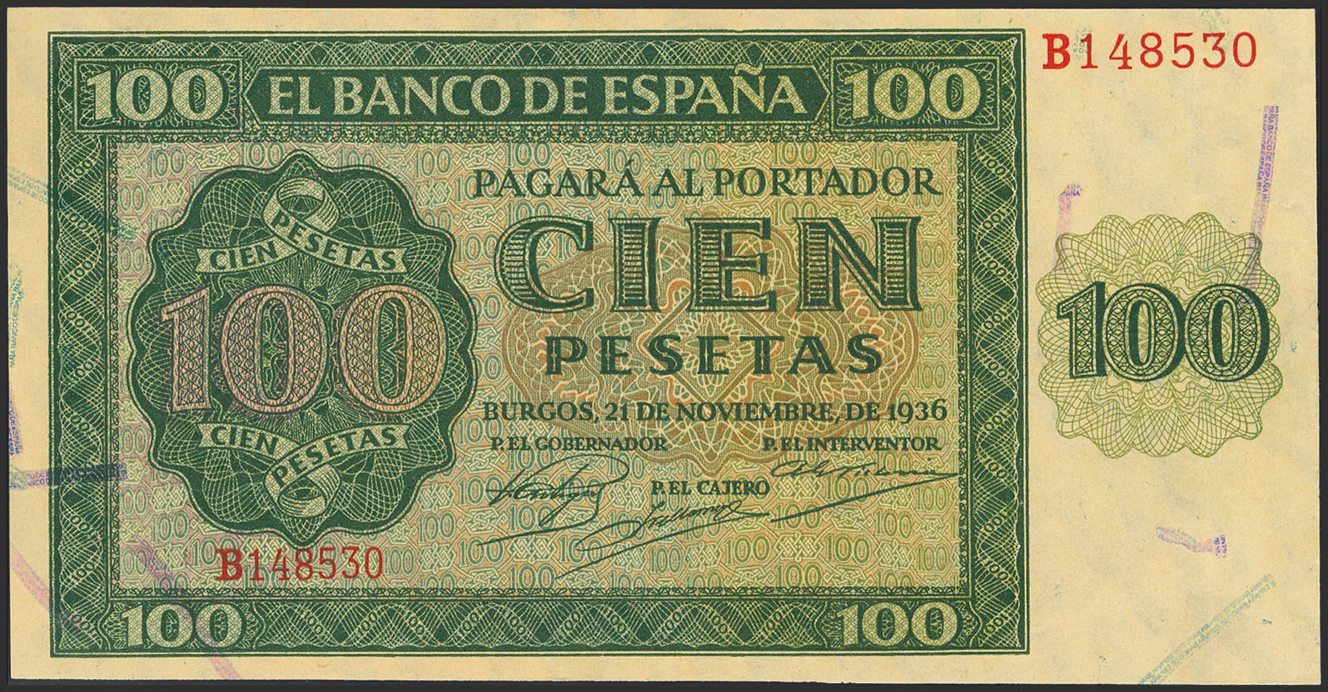100 Pesetas. November 21, 1936. Series B. (Edifil 2023: 421a). It retains much of its original finish. Good Extremely Fine++.