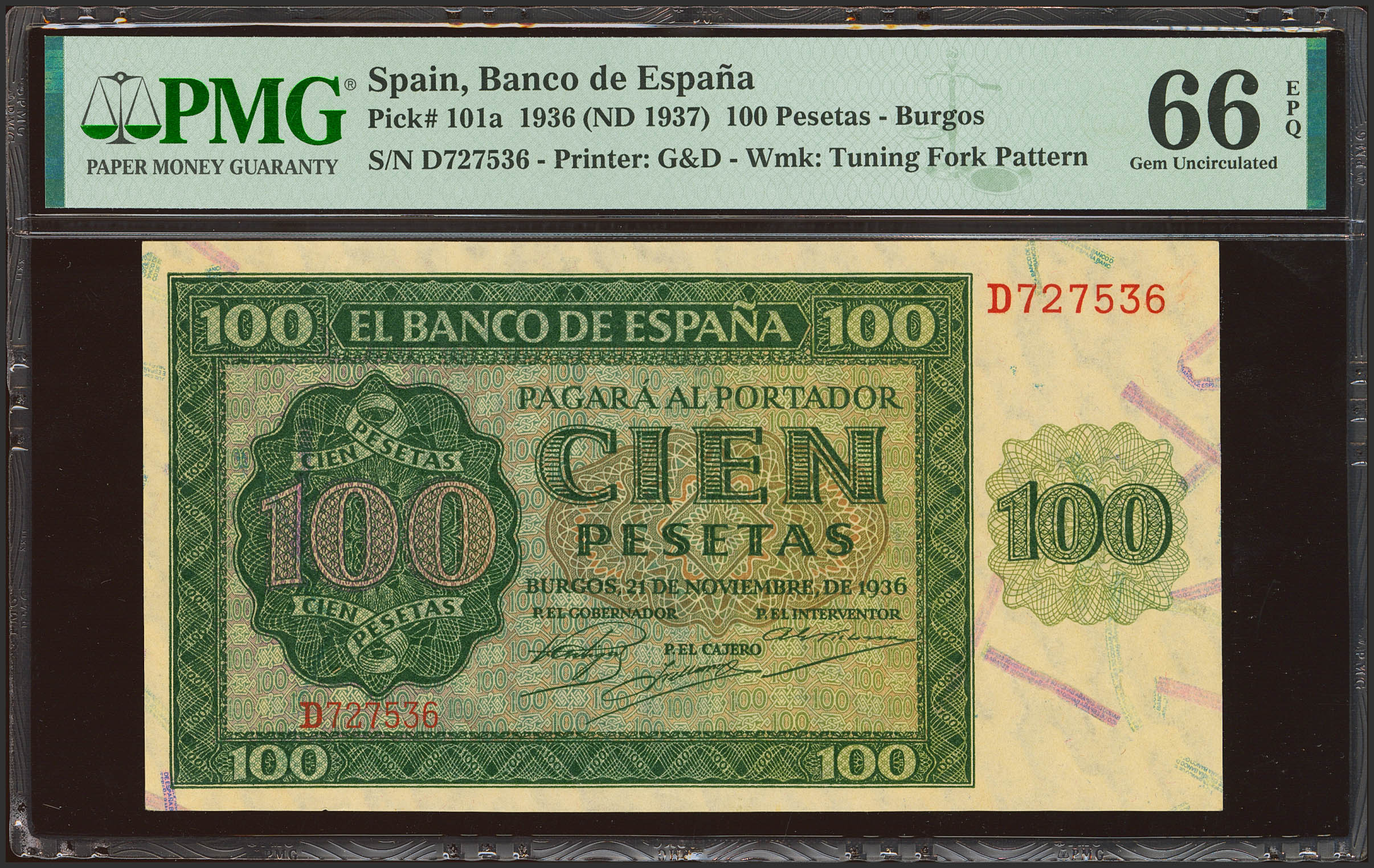English 100 Pesetas. November 21, 1936. Series D. (Edifil 2023: 421a, Pick: 101a). Rare in this exceptional quality, original sizing. Uncirculated. PMG66EPQ package.