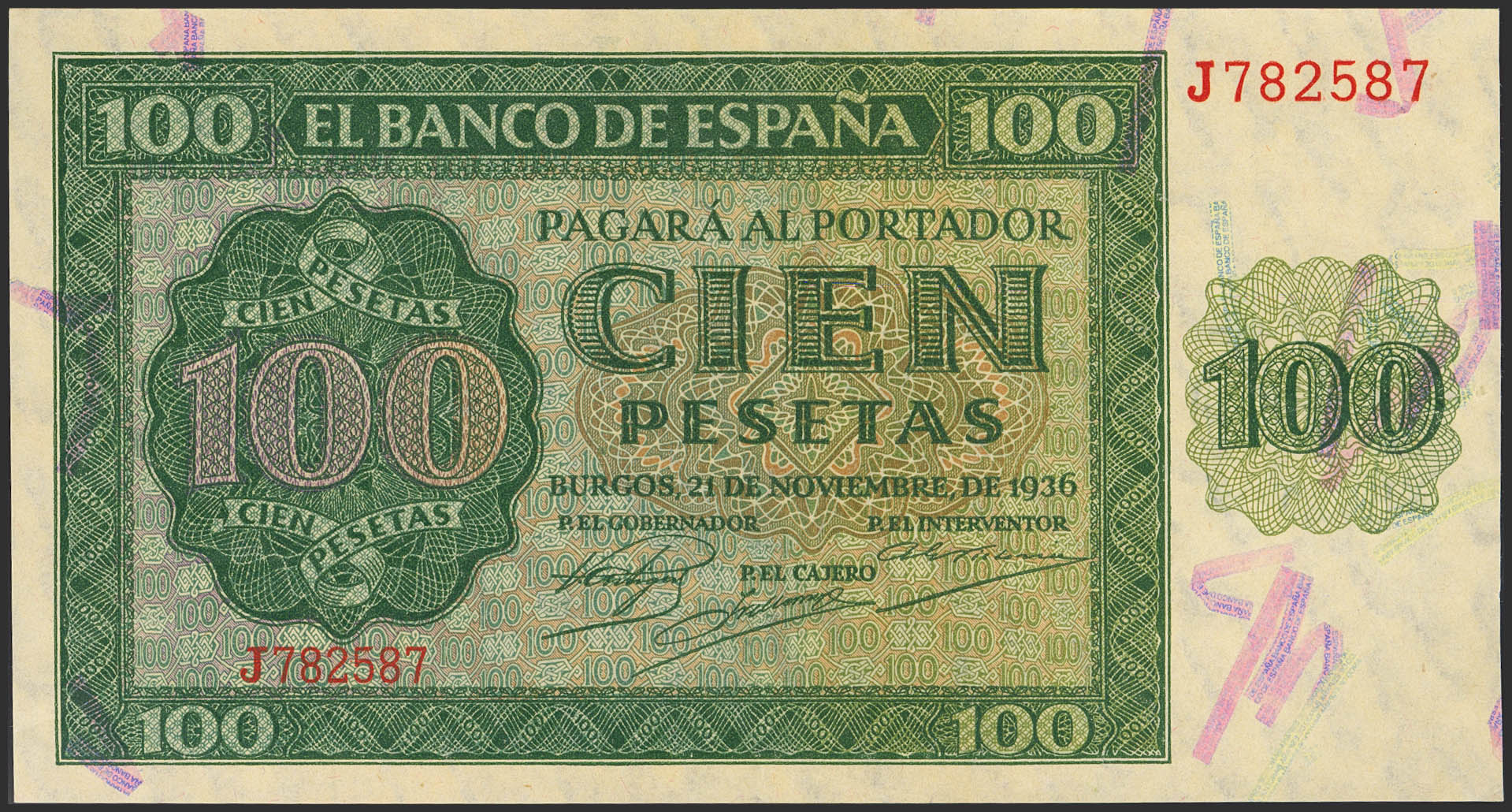 100 Pesetas. November 21, 1936. Series J. (Edifil 2023: 421a). It retains all its original finish. Good Extremely Fine++.