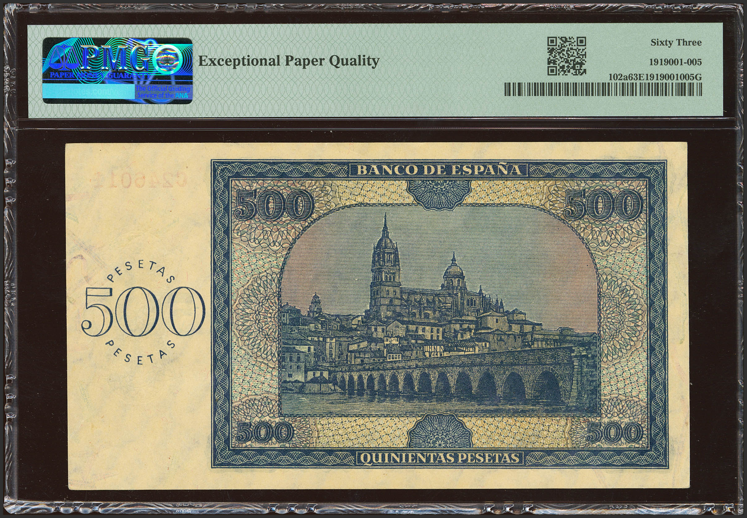 500 Pesetas. November 21, 1936. Series C. (Edifil 2023: 422b, Pick: 102a). Extraordinarily rare in this exceptional quality, original sizing. Uncirculated. PMG63EPQ package. (to give us an idea of the rarity of this note, as of June 1, 2024, it is the sixth highest rated in PMG) PS: We appreciate the information provided by one of our friend-clients in which he indicates the existence of a banknote almost correlative with this same banknote and that was graded by PMG with 64EPQ, thus demonstrating the rarity of this banknote where some of the very rare Known uncirculated examples come from the same consignment, a sign of peace of mind for the future owner. As a significant piece of information, the 1000 Pesetas bill of the same issue from Burgos, according to PMG, there are 11 uncirculated copies, of the offered 500 Pesetas copy only 9 copies. From the notary department of Ibercoin, we believe what the PMG statistics show, which is undoubtedly the rarest uncirculated copy of those issued in Burgos, a circumstance sometimes not valued for the lower nominal value than its older brothers of 1000 Pesetas.