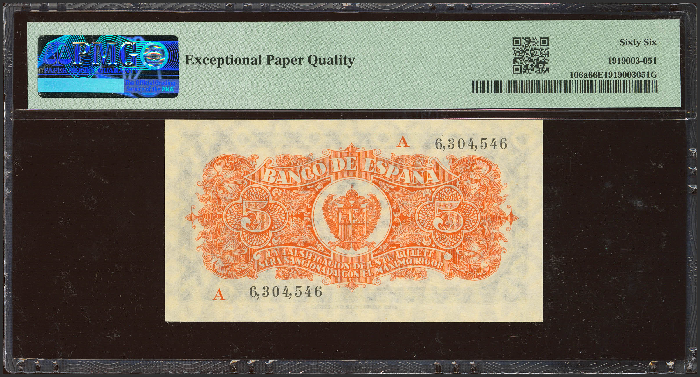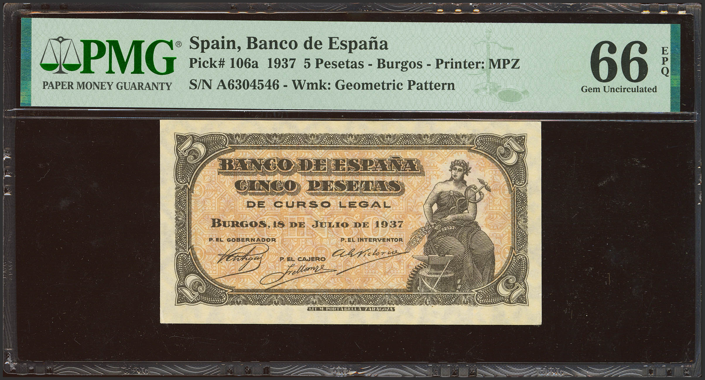 5 Pesetas. July 18, 1937. Series A. (Edifil 2021: 424a, Pick: 106a). Rare in this quality, original sizing. Uncirculated. PMG66EPQ package.