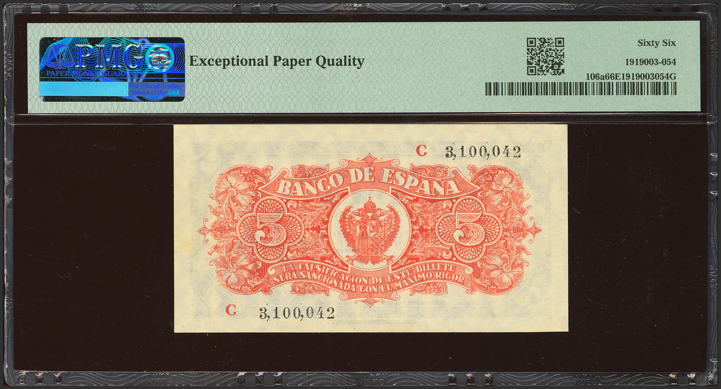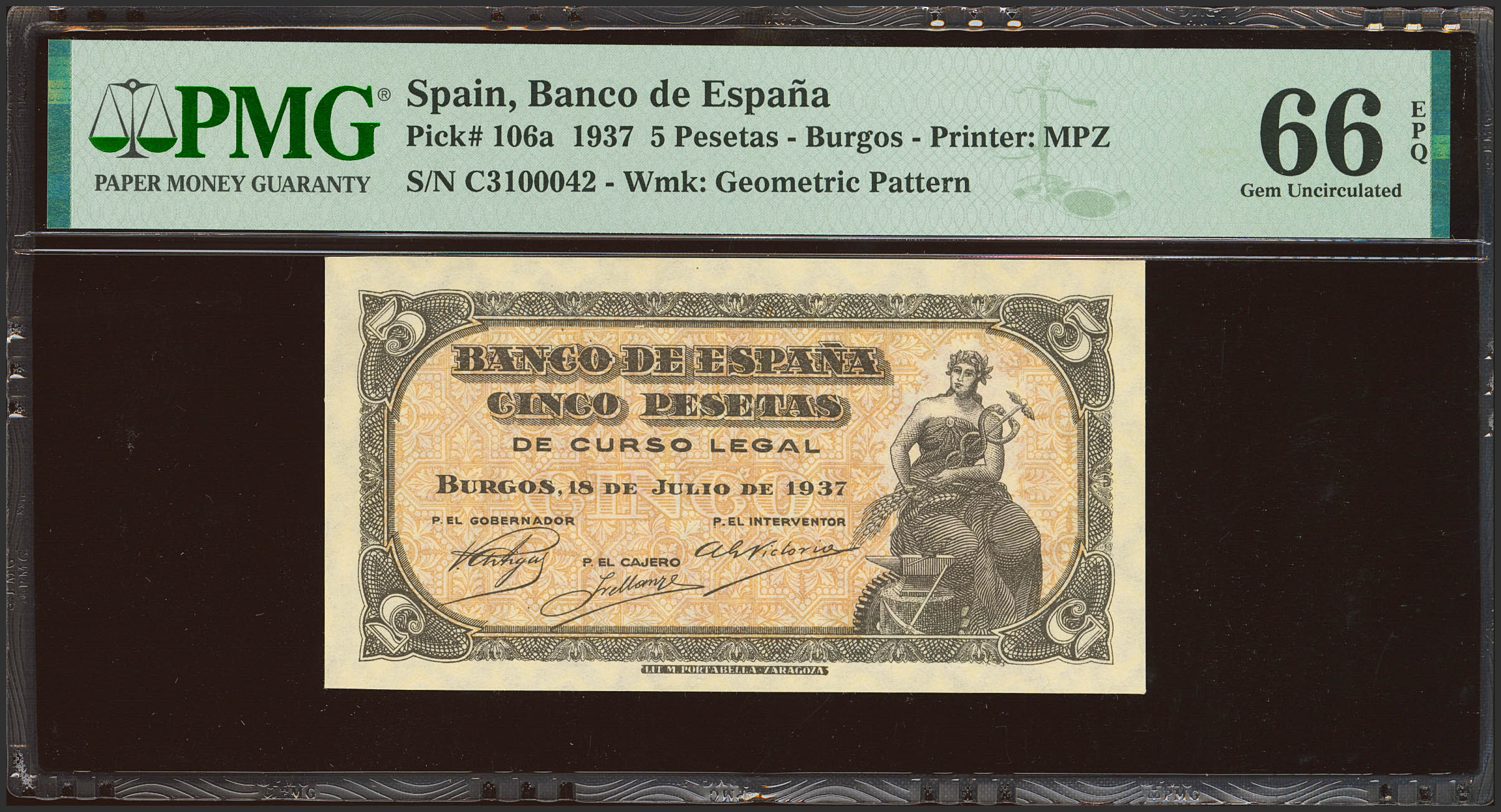 5 Pesetas. July 18, 1937. Series C. (Edifil 2021: 424a, Pick: 106a). Rare in this quality, original sizing. Uncirculated. PMG66EPQ package.