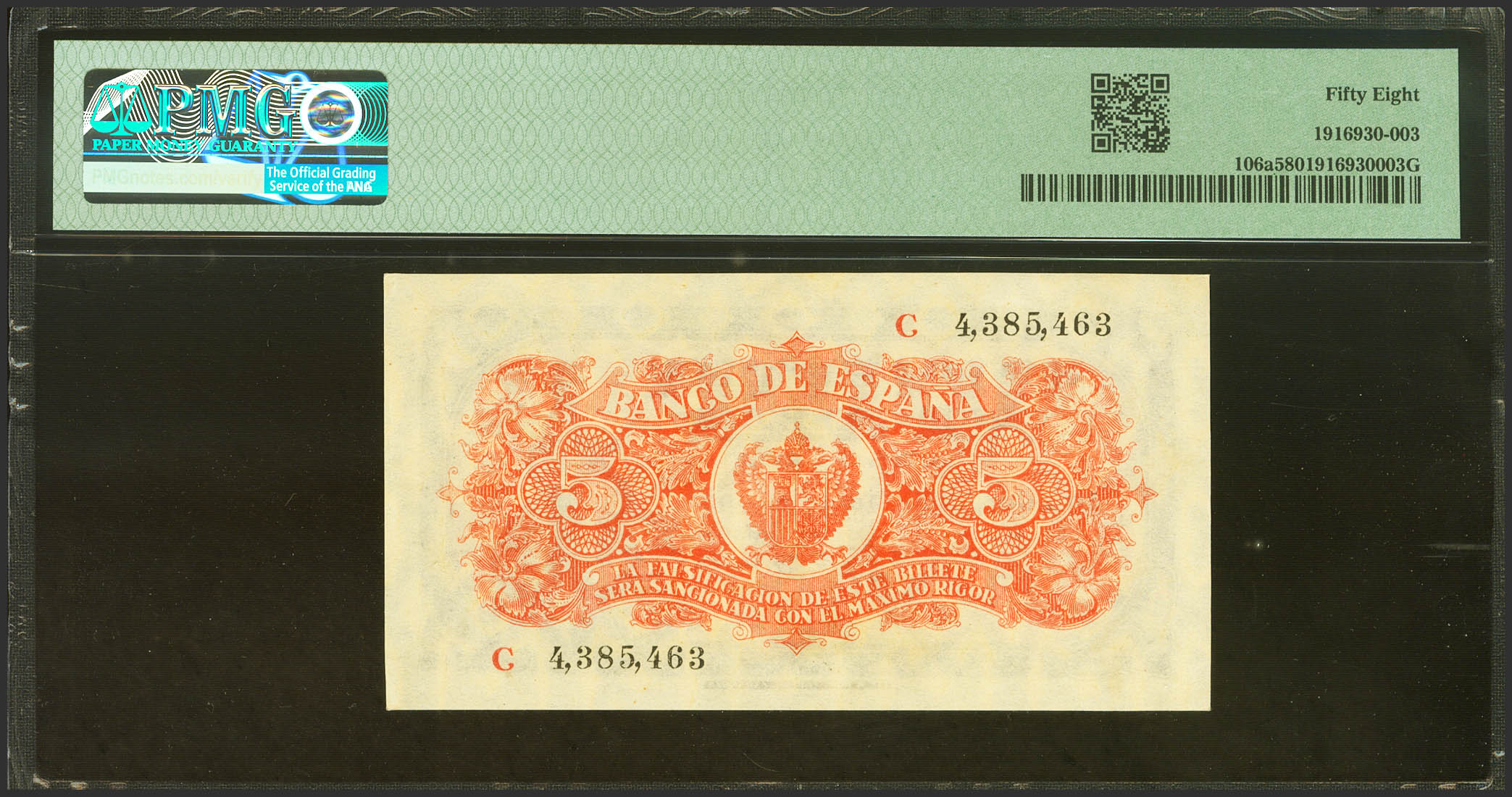 5 Pesetas. July 18, 1937. Series C, last series issued. (Edifil 2023: 424b, Pick: 106a). Good Extremely Fine+. PMG58 encapsulation.