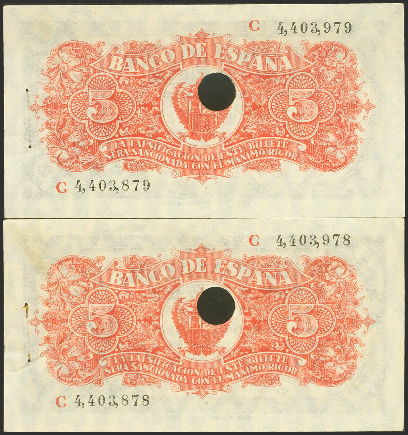 English 5 Pesetas. June 18, 1937. Correlative couple. Series C, last series issued, without numbering and drilling. (Edifil 2021: 424a). Very rare, original sizing, staple points always present on the punched bills. Uncirculated-.