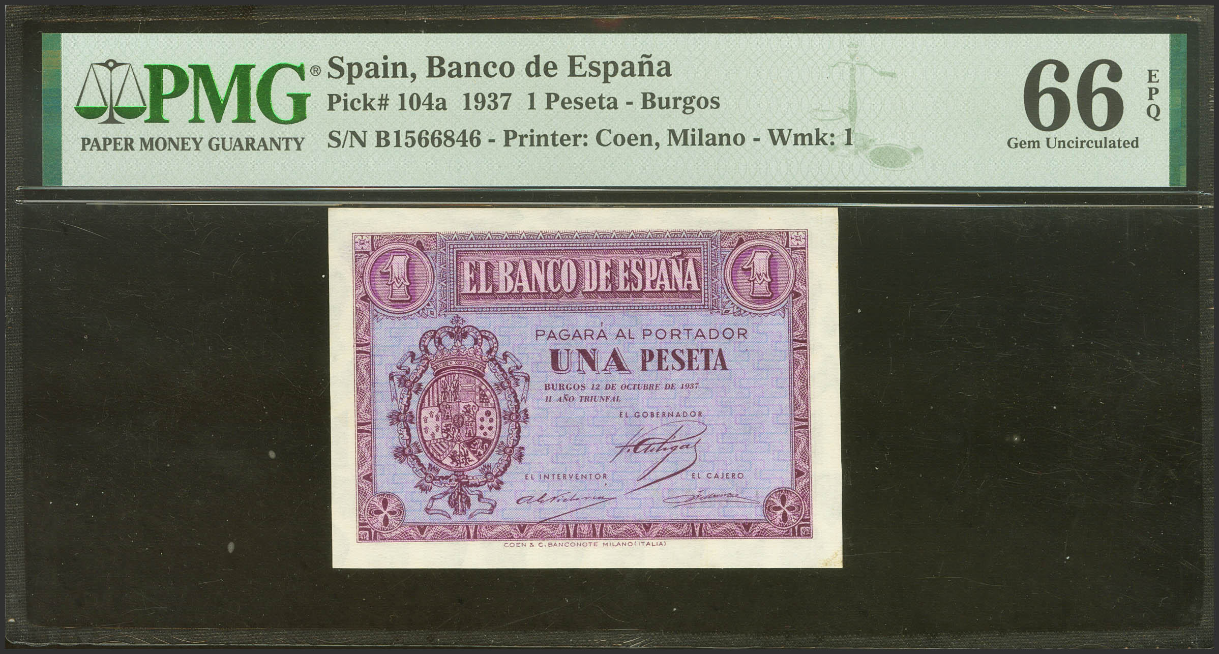 1 Peseta. October 12, 1937. Series B. (Edifil 2021: 425a, Pick: 104a). Rare in this exceptional quality, original sizing. Uncirculated. PMG66EPQ package.