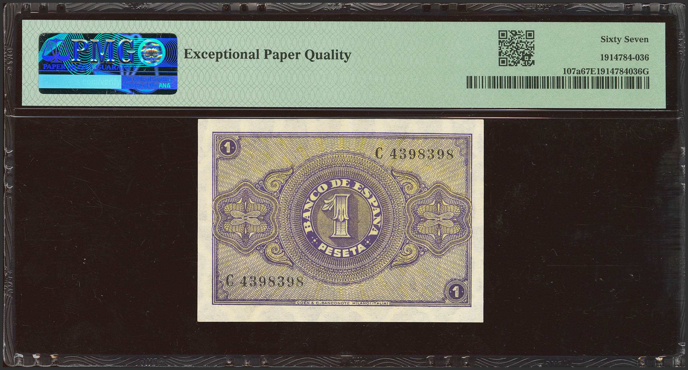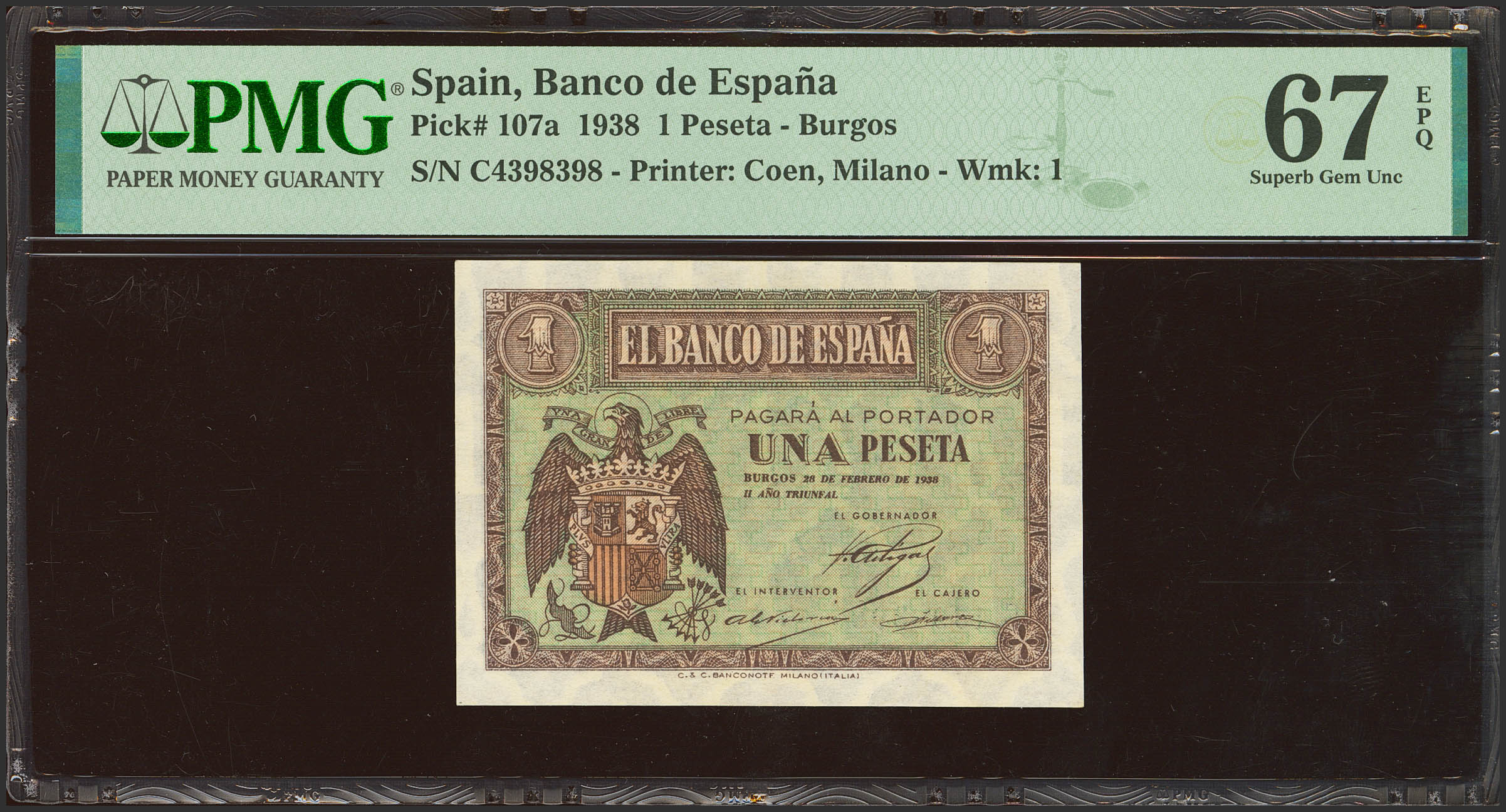 1 Peseta. February 28, 1938. Series C. (Edifil 2023: 427a, Pick: 107a). Original sizing. Uncirculated. PMG67EPQ package.