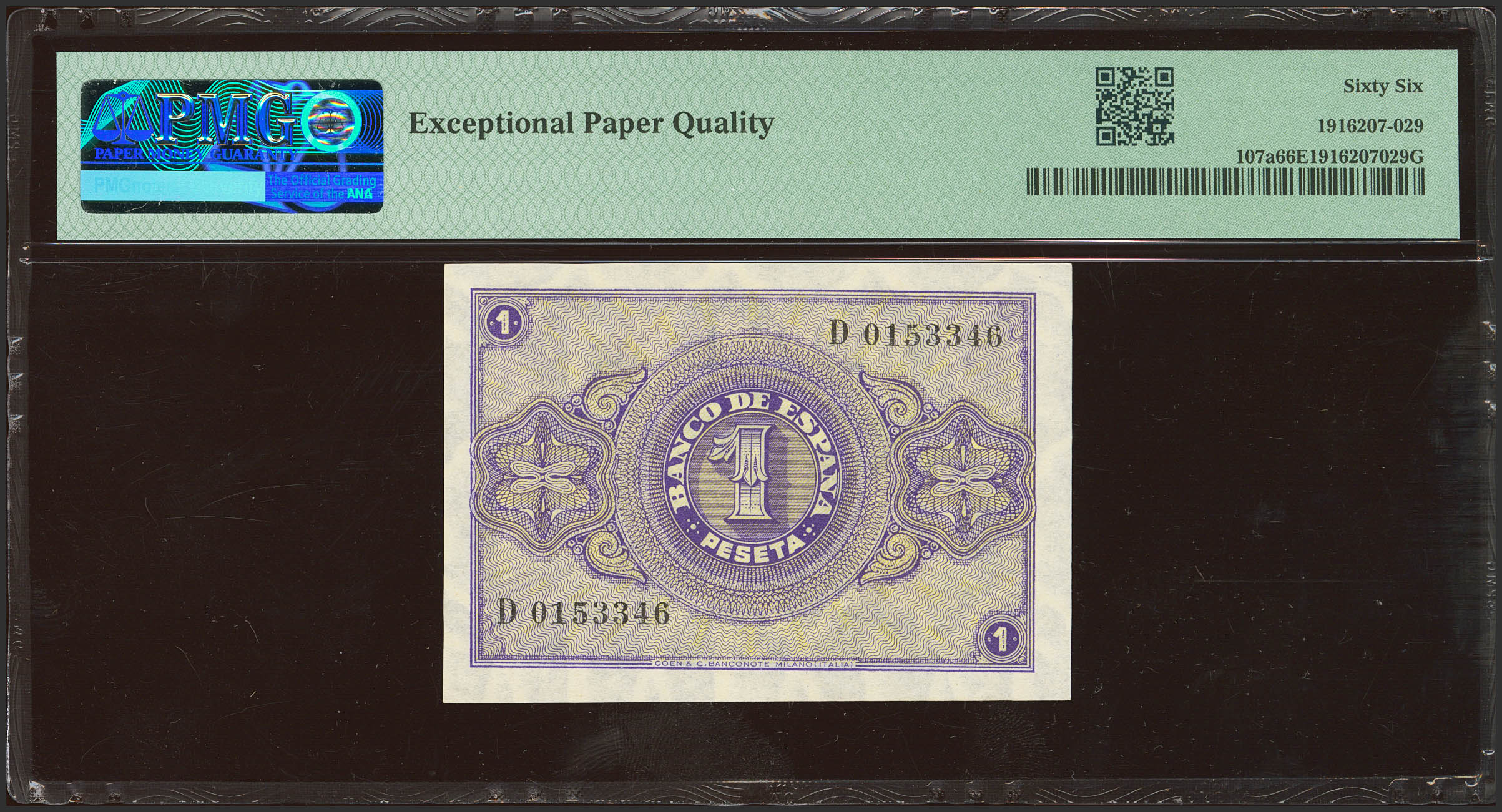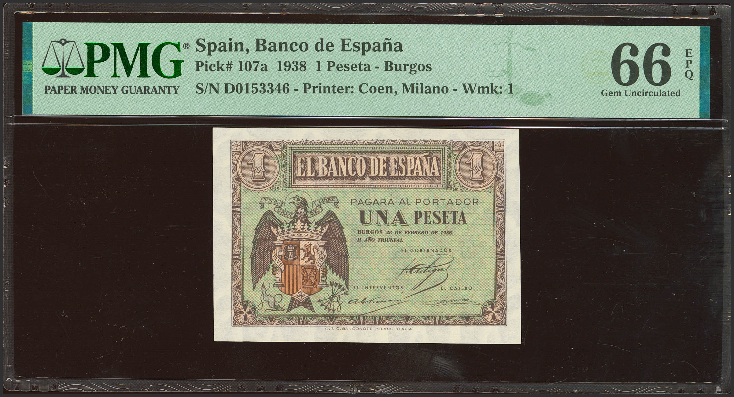 1 Peseta. February 28, 1938. Series D. (Edifil 2023: 427a, Pick: 107a). Original sizing. Uncirculated. PMG66EPQ package.