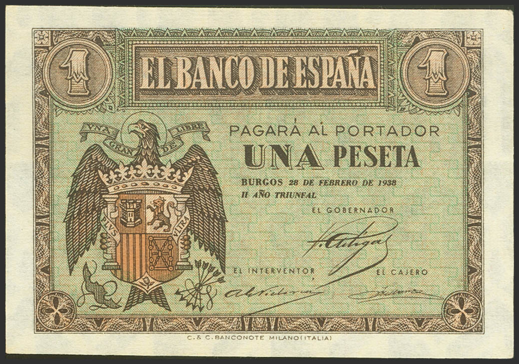 1 Peseta. February 28, 1938. Series E. (Edifil 2023: 427a). Original sizing. Uncirculated-.