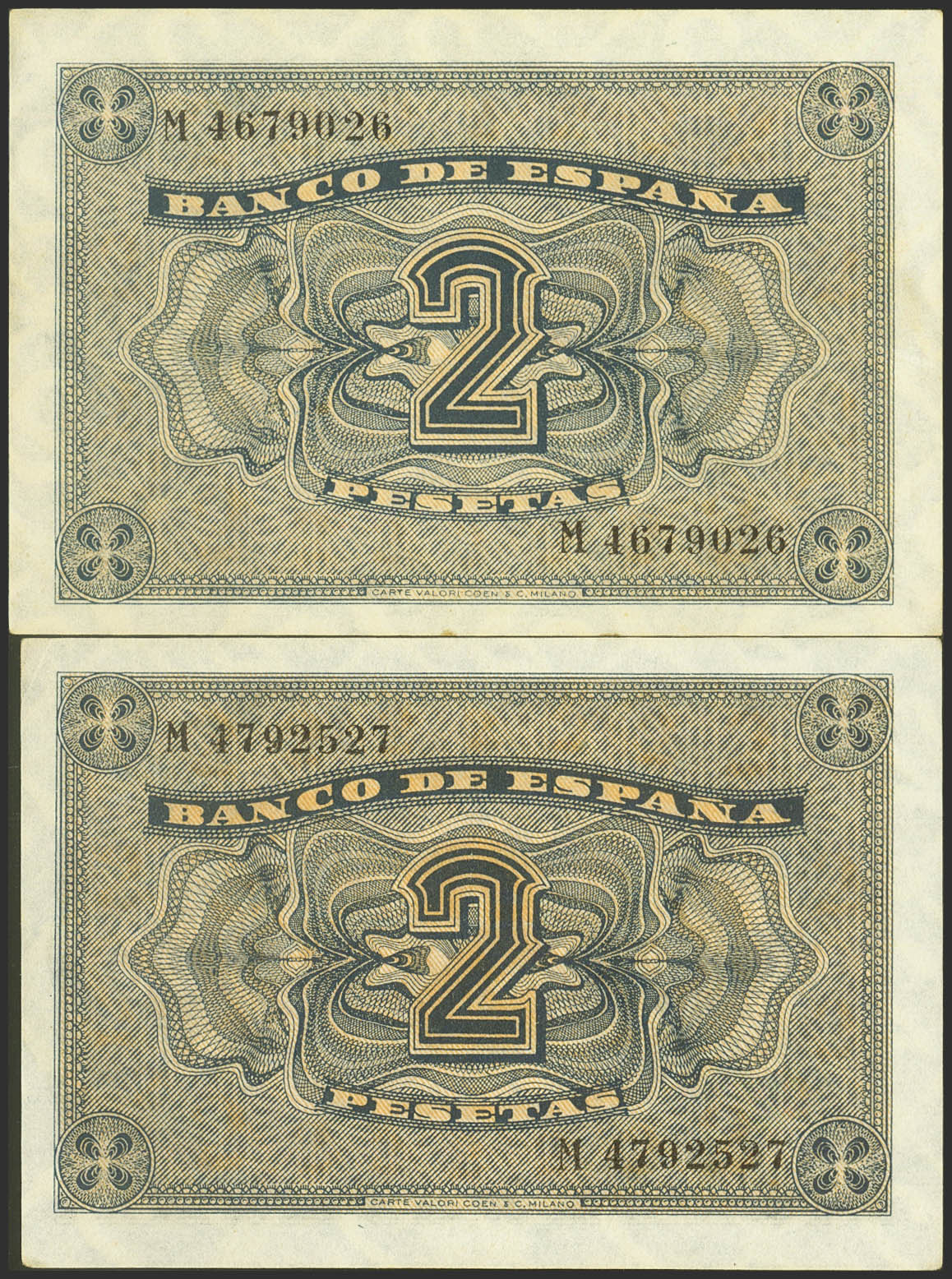 English 2 Pesetas. April 30, 1938. Correlative pair. Series M. (Edifil 2021: 429a). It retains all its original finish. Uncirculated-.