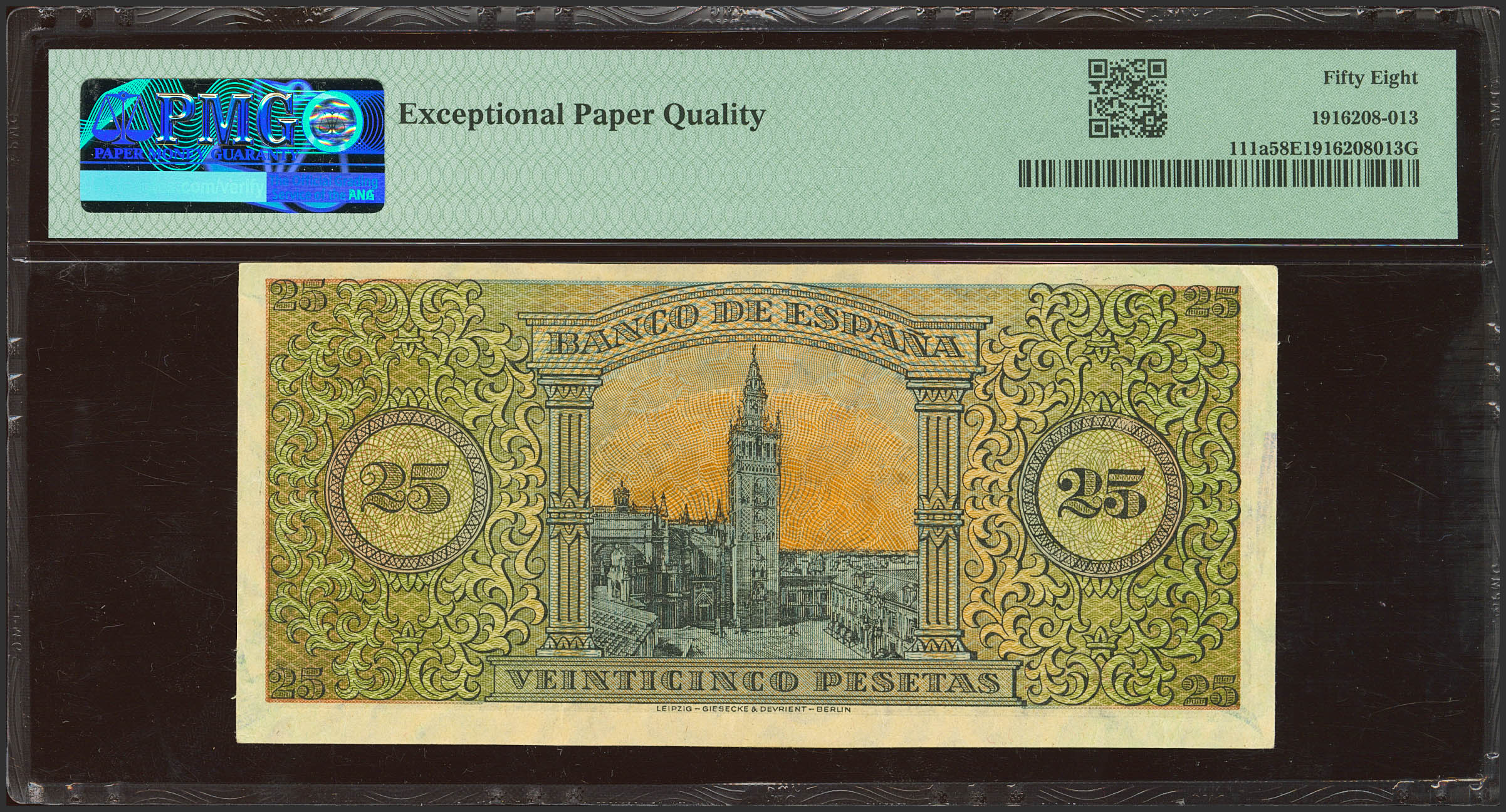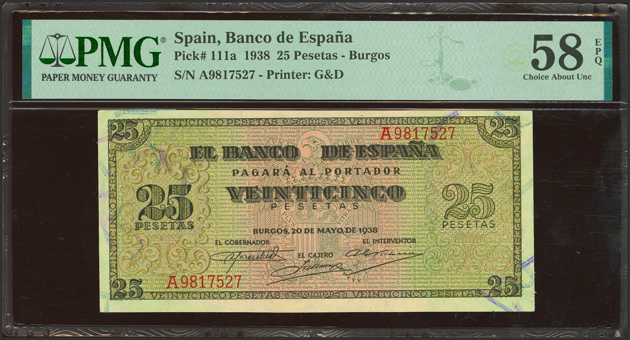 25 Pesetas. May 20, 1938. Series A. (Edifil 2023: 430, Pick: 111a). Original sizing. Good Extremely Fine++. PMG58EPQ package.